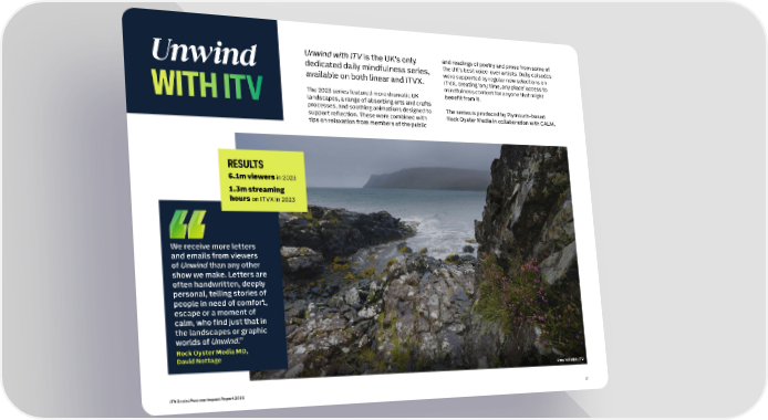 Unwind with ITV is the UK’s only and readings of poetry and prose from some of dedicated daily mindfulness series, the UK’s best voice-over artists. Daily episodes Unwind were supported by regular new selections on available on both linear and ITVX. ITVX, creating ‘any time, any place’ access to mindfulness content for anyone that might The 2023 series featured more dramatic UK benefit from it. WITH ITV landscapes, a range of absorbing arts and crafts processes, and soothing animations designed to The series is produced by Plymouth-based support reflection. These were combined with Rock Oyster Media in collaboration with CALM. tips on relaxation from members of the public RESULTS 6.1m viewers in 2023 1.3m streaming hours on ITVX in 2023 We receive more letters and emails from viewers of Unwind than any other show we make. Letters are often handwritten, deeply personal, telling stories of people in need of comfort, escape or a moment of calm, who find just that in the landscapes or graphic worlds of Unwind.” Rock Oyster Media MD, David Nottage Unwind with ITV ITV Social Purpose Impact Report 2023 17