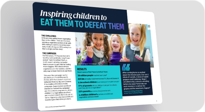 IInnssppiirriinng cg chhiildldrreen tn too EEAAT TT THHEEM TM TO DO DEEFFEEAAT TT THHEEMM THE CHALLENGE: Brits are now eating fewer vegetables than in the 1980s6. Kids are the most notorious vegetable avoiders of all, with 89% failing to eat the recommended daily intake of veg and 29% eating less 7 than a single portion daily . THE CAMPAIGN: For five years, ITV has worked with healthy-eating initiative Veg Power on Eat Them to Defeat Them, a multi-award-winning campaign that is proven to get children eating Eat Them to Defeat Them campaign more veggies. The idea is simple: vegetables are the baddies, and the RESULTS only way to beat them is to eat them. from 5 years of Eat Them to Defeat Them: After coming home so excited This year the campaign ran for 36 million people reached each year8 about the mission pack, Cian ate 2 six weeks on ITV airtime worth slices of carrots, 2 slices of sweet £1.5m, with that amount matched £17.5m of media investment across ITV, Sky and Channel 4 peppers and 2 sultanas. Wow! I between them by Sky and Channel 1.5m school children have taken part in 4,884 schools9 am witnessing a miracle unfolding 4 to enable a £3 million media campaign. Supermarket and food 77% of parents whose children took part in schools before my eyes! Tomorrow, our brands co-funded the campaign said they ate more vegetables10 next mission is to defeat the and the schools programme, where 53% parents perceive a long term benefit grapes and the sweetcorn. Kapow!” children try vegetables at school Parent of child participating and receive reward charts to use at 1.4 billion children’s portions of additional in Eat Them To Defeat Them home. Agencies adam&eveDDB and vegetables sold as a result Essence give their time pro bono. ITV Social Purpose Impact Report 2023 55