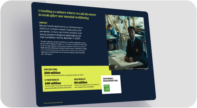 Creating a culture where we all do more to look after our mental wellbeing CONTEXT Mental health declined to an all-time low in 2020 but numbers haven’t improved post- pandemic. In fact, one in five children and young people in England aged eight to 25 1 had a probable mental disorder in 2023 . The NHS advises we all look after our mental wellbeing, just as we look after physical health, so ITV used our platform and scale to encourage children and young people to proactively care for their mental wellbeing. We also looked closer to home to create more conversations across the media industry about how we represent mental health on screen and support participants and colleagues. OUR 2023 GOAL Britain Get Talking – The Hardest Subject campaign 200 million actions to improve mental or physical health by 2023 5-YEAR RESULTS 2023 RESULTS SUSTAINABLE 249 million 84 million DEVELOPMENT GOAL actions taken to improve mental and actions to support mental wellbeing physical health between 2019-2023 as a result of our campaigns IITTV SV Soocciiaal Pl Puurrppoosse Ie Immppaacct Rt Reeppoorrt 2t 2002233 99