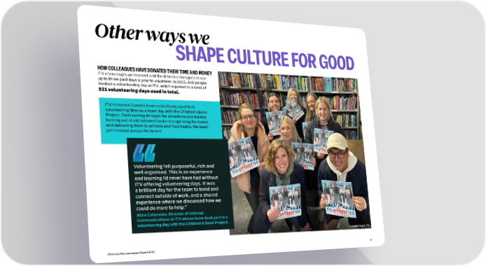 Other ways we SHAPE CULTURE FOR GOOD HOW COLLEAGUES HAVE DONATED THEIR TIME AND MONEY ITV encourages permanent and fixed-term colleagues to use up to three paid days a year to volunteer. In 2023, 668 people booked a volunteering day at ITV, which equated to a total of 921 volunteering days used in total. ITV’s Internal Comms team collectively used their volunteering time as a team day with the Children’s Book Project. From sorting through the donations and making bunting out of old tattered books to organising the books and delivering them to schools and food banks, the team got involved across the board. Volunteering felt purposeful, rich and well organised. This is an experience and learning I’d never have had without ITV offering volunteering days. It was a brilliant day for the team to bond and connect outside of work, and a shared experience where we discussed how we could do more to help.” Alice Colarusso, Director of Internal Communications at ITV whose team took part in a volunteering day with the Children’s Book Project. Volunteering at ITV ITV Social Purpose Impact Report 2023 60
