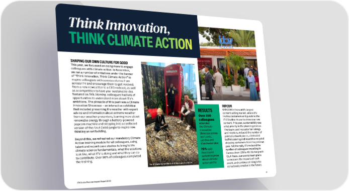 Think Innovation, THINK CLIMATE ACTION SHAPING OUR OWN CULTURE FOR GOOD This year, we focussed on doing more to engage colleagues with climate action. In November, we ran a number of initiatives under the banner of “Think Innovation, Think Climate Action” to inspire colleagues with success stories from across ITV and encourage them to get involved. From a new newsletter to a CEO vodcast, as well as a competition to have your sustainable idea featured on This Morning, colleagues had lots of MIPCOM opportunities to understand more about ITV’s ambitions. The pinnacle of this push was a Climate Innovation Showcase – an interactive exhibition MIPCOM that included presenting the weather with expert RESULTS MIPCOM is the world’s largest advice and information about extreme weather Over 350 content selling market, where ITV from our weather presenters, learning more about invites customers and guests to the renewable energy through a battery-powered colleagues ITV Studios House to showcase new popcorn machine and stepping into a cardboard attended content. This year, sustainability was version of the I’m A Celeb jungle to inspire new the Climate a top priority in the planning process. thinking on set building. Innovation The team used reusable furnishings Showcase across and interiors, reduced the number of Beyond this, we refreshed our mandatory Climate our Leeds, printed artwork pieces, eliminated Action training module for all colleagues, using London and buffet catering and reused or recycled talent and recent case studies to bring to life Manchester sites shipping containers from the previous climate science fundamentals, what the solutions 75% said year. Additionally, ITV reduced the look like, what ITV is doing and what they can do they learnt number of colleagues travelling to to contribute. Over 90% of colleagues completed something new Cannes from 120 to 49. Working with the training. about climate ISLA Trace, our events team plans I’m A Celebrity Get Me Out of Here cardboard set action at ITV to measure the impacts of each event, and continue striving to be consciously creative in the future. ITV Social Purpose Impact Report 2023 29