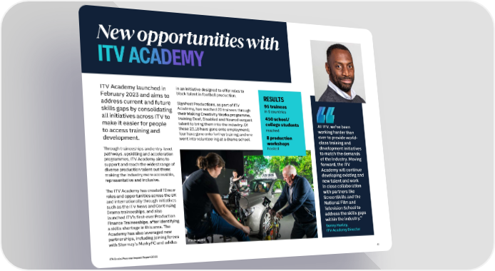 New opportunities with ITV ACADEMY ITV Academy launched in in an initiative designed to offer roles to February 2023 and aims to black talent in football production. RESULTS address current and future SignPost Productions, as part of ITV 95 trainees skills gaps by consolidating Academy, has reached 23 trainees through in 9 countries all initiatives across ITV to their Making Creativity Works programme, 450 school/ training Deaf, Disabled and Neurodivergent make it easier for people talent to bring them into the industry. Of college students At ITV, we’ve been to access training and these 23,18 have gone onto employment; reached working harder than four have gone onto further training; and one 8 production ever to provide world- development. went into volunteering at a drama school. class training and workshops development initiatives Through traineeships and entry-level hosted pathways, upskilling and acceleration to match the demands programmes, ITV Academy aims to of the industry. Moving support and reach the widest range of forward, the ITV diverse production talent out there; Academy will continue making the industry more accessible, developing existing and representative and inclusive. new talent and work The ITV Academy has created 72 new in close collaboration roles and opportunities across the UK with partners like and internationally through initiatives ScreenSkills and the such as the ITV News and Continuing National Film and Drama traineeships, and also Television School to launched ITV’s first-ever Production address the skills gaps Finance Traineeships, after identifying within the industry.” a skills shortage in this area. The Academy has also leveraged new Sonny Hanley, partnerships, including joining forces ITV Academy Director with Stormzy’s MerkyFC and adidas ITV Academy ITV Social Purpose Impact Report 2023 53