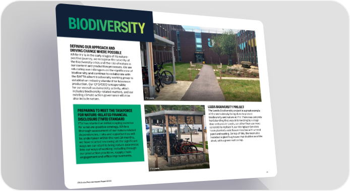 BBIODIIODIVVEERRSSIITTYY DEFINING OUR APPROACH AND DRIVING CHANGE WHERE POSSIBLE While ITV is in the early stages of its nature- positive journey, we recognise the severity of the biodiversity crisis and the role of nature in our content and production processes. We are educating our colleagues on the significance of biodiversity and continue to collaborate with the BAFTA albert biodiversity working group to establish an industry standard for television production. Our CFO/COO is responsible for our overall sustainability activity, which includes biodiversity-related matters, and our existing climate action governance will now also include nature. ITV Leeds LEEDS BIODIVERSITY PROJECT PREPARING TO MEET THE TASKFORCE The Leeds Biodiversity project is a great example FOR NATURE-RELATED FINANCIAL of the work already being done to protect DISCLOSURE (TNFD) STANDARD biodiversity and nature at ITV. There was concrete ITV has started an initial scoping exercise hardstanding that was deteriorating by a stage- for a nature-positive strategy. While a door entrance in Leeds, so rather than use more thorough assessment of our nature related concrete to replace it, our Workplace Services dependencies, risks and opportunities will team planted a wild flower meadow with a small be undertaken within the next 24 months, pond and seating. On top of this, the team also we have started reviewing all the significant installed a giant bug house that doubles as a bike ways we can start to bring nature awareness shed, with a green roof on top. into our ways of working, including through our production practices, supply chain engagement and office improvements. ITV Leeds ITV Social Purpose Impact Report 2023 34