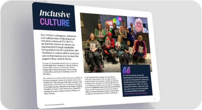 Inclusive CULTURE Our brilliant colleagues, networks and collaborators help shape an inclusive culture at ITV. At ITV, we want to ensure all voices are represented through equitable hiring and promotion practices. We champion a culture where everyone can be themselves and receive the support they need to thrive. To support the implementation of our Diversity Acceleration Plan, we have a Cultural Advisory Council that is now in its third year. These independent external advisers, from a range of industries, advise and challenge us on our Amplify 2.0 DEI plans. We continue to provide tools, training and guidance In our inaugural line manager survey, 85% of If I had my doubts about the to help colleagues create an inclusive culture. We colleagues agreed that their managers build an seriousness of ITV’s commitment trained over 450 colleagues through a range of DEI inclusive team environment. In 2024, we will work to representing Britain’s diversity, workshops in 2023 and some colleagues took part to improve the experiences of Black, Mixed Race/ inside and out, at every level of in multiple courses. Workshops included: Creating Dual Heritage and other minority ethnic colleagues the organisation, then the sheer Disability Inclusion, Deaf Awareness, Global DEI as ITV’s engagement and culture survey found that amount of effort, resources and, training, Inclusive Leader, Inclusive Hiring, and these groups feel less included. We are working yes, love, that went into Amplify Race Fluency. with an external facilitator to tailor interventions 2.0 dispelled them entirely.” to improve the experience of these colleagues. Sameer Modha, Amplify participant ITV Social Purpose Impact Report 2023 42