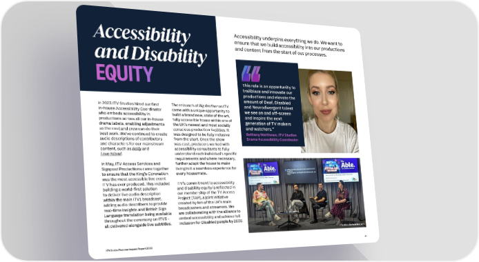 Accessibility underpins everything we do. We want to Accessibility ensure that we build accessibility into our productions and Disability and content from the start of our processes. EQUITY This role is an opportunity to trailblaze and innovate our productions and elevate the amount of Deaf, Disabled In 2023 ITV Studios hired our first The relaunch of Big Brother on ITV and Neurodivergent talent in-house Accessibility Coordinator came with a unique opportunity to we see on and off-screen who embeds accessibility in build a brand new, state of the art, and inspire the next productions across all our in-house fully accessible house within one of generation of TV makers drama labels, enabling adjustments the UK’s newest and most socially and watchers.” so the cast and crew can do their conscious production facilities. It best work. We’ve continued to create was designed to be fully inclusive Bethany Matthews, ITV Studios audio descriptions of contributors from the start. Once the show Drama Accessibility Coordinator and characters for our mainstream was cast, producers worked with content, such as Nolly and accessibility consultants to fully Love Island. understand each individual’s specific requirements and where necessary, In May, ITV Access Services and further adapt the house to make Signpost Productions came together living in it a seamless experience for to ensure that the King’s Coronation every housemate. was the most accessible live event ITV has ever produced. This included ITV’s commitment to accessibility building a world-first solution and disability equity is reflected in to deliver live audio description our membership of the TV Access within the main ITV1 broadcast, Project (TAP), a joint initiative adding audio describers to provide created by ten of the UK’s main real-time insights and British Sign broadcasters and streamers. We Language translation being available are collaborating with the alliance to throughout the ceremony on ITV3 – embed accessibility and achieve full all delivered alongside live subtitles. inclusion for Disabled people by 2030. ITV Able Network event ITV Social Purpose Impact Report 2023 44