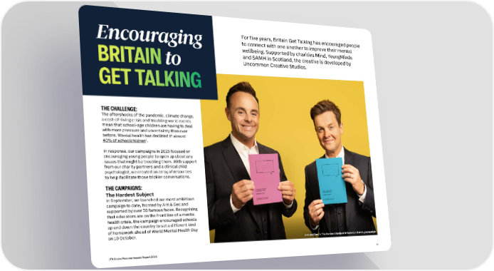 For five years, Britain Get Talking has encouraged people EEnnccoouurragagiingng to connect with one another to improve their mental wellbeing. Supported by charities Mind, YoungMinds and SAMH in Scotland, the creative is developed by BRIBRITTAAININ ttoo Uncommon Creative Studios. GGEETT T TAALLKINKINGG THE CHALLENGE: The aftershocks of the pandemic, climate change, a cost-of-living crisis and troubling world events mean that school-age children are having to deal with more pressure and uncertainty than ever before. Mental health has declined in almost 2 40% of schoolchildren . In response, our campaigns in 2023 focused on encouraging young people to open up about any issues that might be troubling them. With support from our charity partners and a clinical child psychologist, we created an array of resources to help facilitate those trickier conversations. THE CAMPAIGNS: The Hardest Subject In September, we launched our most ambitious campaign to date, fronted by Ant & Dec and supported by over 30 famous faces. Recognising that educators are on the front line of a mental health crisis, the campaign encouraged schools up and down the country to set a different kind of homework ahead of World Mental Health Day on 10 October. Ant and Dec in The Hardest Subject Britain Get Talking campaign ITV Social Purpose Impact Report 2023 10