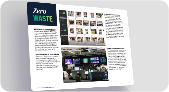 Emmerdale Prop Auction Emmerdale’s art department has Zero been looking at the props they use, cutting down on waste, and increasing recycling and reselling. At the beginning of 2023, Emmerdale WASTE launched a Prop Auction which was rolled out across the entire Yorkshire site, with colleagues able to bid on as-seen-on-screen props, including everything from mugs to IMPROVING OUR DATA QUALITY sofas. Anything that was not sold Achieving our ambition of becoming was given to charity and proceeds a zero waste business starts with were donated to a regional charity, better understanding our sources of to support the communities around waste. Capturing accurate data for Leeds and Yorkshire. all activities that generate waste is challenging. Our Workplace Services team closely monitor office waste and our technology teams partner Emmerdale prop auction with refurbishment companies to ensure that no waste goes to landfill. News Office Refurbishment Our next step is to focus on TV ITV’s Millbank office houses both our production waste. political and weather teams. With BUILDING A CIRCULAR ECONOMY an office refresh scheduled for 2023 and ITV colleagues relocating from Our priority in 2023 was to identify Grays Inn Road to White City, the opportunities to foster a more News Team seized the opportunity circular economy, implementing to reduce waste and save costs by new projects to reduce consumption reusing floor tiles and office furniture through innovative design, that were made redundant in the repurposing of materials, and the move. This sustainable initiative not recycling of anything that couldn’t only saved money on the Milbank be reused. refurbishment but also helped towards our reuse targets. ITV Millbank ITV Social Purpose Impact Report 2023 27