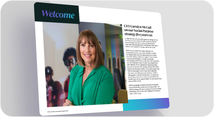 Welcome CEO Carolyn McCall on our Social Purpose strategy 昀椀ve years on In 2019 we set out a Social Purpose strategy across four focus areas: Better Health, Diversity, Equity and Inclusion, Climate Action and Giving Back. Each had clear targets and timeframes, helping us deliver our ambition to shape culture for good. 2023 sees us reach the major milestone of surpassing our five-year goal for Better Health. Our target was to encourage audiences to take over 200 million actions to support their mental or physical wellbeing. Through campaigns encouraging children to move more and eat better, and our flagship mental health campaign Britain Get Talking, I’m very pleased to announce that we have surpassed this target, hitting 249 million actions by the end of 2023. This year’s Britain Get Talking campaign in particular was a highlight, with over 1.2 million parents and their children taking part in our homework task. The task, set by schools across the country on World Mental Health Day, encouraged children to talk about what was on their minds. With increasing numbers of people living with mental ill health, particularly young people, our 2024 strategy will have a sharper focus on mental wellbeing, with Britain Get Talking continuing to take centre stage. ITV Social Purpose Impact Report 2023 33