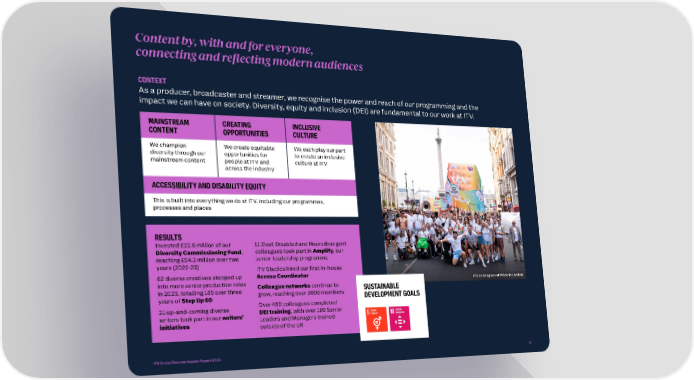 Content by, with and for everyone, connecting and re昀氀ecting modern audiences CONTEXT As a producer, broadcaster and streamer, we recognise the power and reach of our programming and the impact we can have on society. Diversity, equity and inclusion (DEI) are fundamental to our work at ITV. MAINSTREAM CREATING INCLUSIVE CONTENT OPPORTUNITIES CULTURE We champion We create equitable We each play our part diversity through our opportunities for to create an inclusive mainstream content people at ITV and culture at ITV across the industry ACCESSIBILITY AND DISABILITY EQUITY This is built into everything we do at ITV, including our programmes, processes and places RESULTS Invested £22.8 million of our 11 Deaf, Disabled and Neurodivergent Diversity Commissioning Fund, colleagues took part in Amplify, our reaching £54.2 million over two senior leadership programme years (2022-23) ITV Studios hired our first in-house 62 diverse creatives stepped up Access Coordinator ITV colleagues at Pride in London into more senior production roles Colleague networks continue to SUSTAINABLE in 2023, totalling 185 over three grow, reaching over 3000 members years of Step Up 60 DEVELOPMENT GOALS 21 up-and-coming diverse Over 450 colleagues completed writers took part in our writers’ DEI training, with over 180 Senior initiatives Leaders and Managers trained outside of the UK IITTV SV Soocciiaal Pl Puurrppoosse Ie Immppaacct Rt Reeppoorrt 2t 2002233 3636