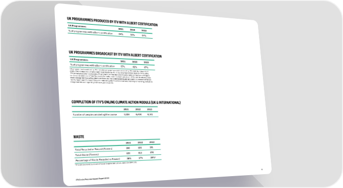 UK PROGRAMMES PRODUCED BY ITV WITH ALBERT CERTIFICATION UK Programmes 2021 2022 2023 % of programmes with albert certification 84% 94% 94% UK PROGRAMMES BROADCAST BY ITV WITH ALBERT CERTIFICATION UK Programmes 2021 2022 2023 % of programmes with albert certification 57% 42% 67% UK programmes broadcast by ITV: Includes programmes commissioned by ITV made by independent production companies. UK programmes produced by ITV: Includes programmes made by ITV Studios, ITV owned production companies. TV productions that implement sustainable production techniques can become albert‑certified. For more information see the albert website. In 2021, we introduced a new methodology for measuring albert certification. The commissioning and production process is different for ITV Sport and ITV News. They are embedding albert certification into their ways of working, and will be integrated into our reporting from next year onwards. COMPLETION OF ITV’S ONLINE CLIMATE ACTION MODULE (UK & INTERNATIONAL) Year 2021 2022 2023 Number of people completing the course 5,528 6,400 6,561 WASTE Year 2021 2022 2023 Total Recycled or Reused (Tonnes) 280 222 251 Total Waste (Tonnes) 830 812 876 Percentage of Waste Recycled or Reused 36% 27% 29%* *The emissions data provided has undergone limited assurance by ERM CVS. ITV Social Purpose Impact Report 2023 65