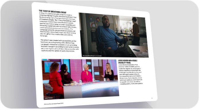 THE ‘COST OF BREATHING CRISIS’ In May, ITV partnered with Scope to create a campaign highlighting the devastating impact that the increasing cost of living is having on the lives of Disabled people. The “Cost of Breathing Crisis” campaign showed how many Disabled people need to use more energy to power essential and lifesaving equipment such as wheelchairs, hoists, communication devices and ventilators. The campaign aimed to ensure Disabled people and their families knew that Scope was there to help and ITV gifted the creative idea and airtime to Scope. The advert was created with accessibility at the forefront, including having a BSL (British Sign Language) interpreter available on set, providing bespoke transport according to each actor’s needs and ensuring the ad itself was fully accessible with captions and the option of audio description. The Cost of Breathing Crisis campaign LOOSE WOMEN NON-VISIBLE DISABILITY PANEL Loose Women hosted their first ever non-visible disability panel to tackle the stigmas surrounding non- visible disabilities and spotlight the challenges faced by the one in seven neurodivergent people in the UK. Guest panellists included Christine McGuinness, Nadia Sawalha, Denise Welch and Judi Love, all of whom are living with non-visible disabilities including autism, ADHD and dyslexia. Loose Women ITV Social Purpose Impact Report 2023 45
