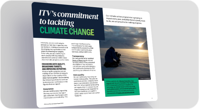 Our climate action programme is growing in ITV’s commitment impact every year, and while there is plenty more to tackling to do, we are proud to be making progress. CLIMATE CHANGE Internally, we are continuing to and Scope 3 (influenced by embed our Net Zero trajectory into ITV) emissions for 2023 were our decision-making processes and independently assured by ERM developing more granular action Certification and Verification plans for meeting our targets. Services Limited (ERM CVS). Externally, we are continuing to work closely with key industry Transparency stakeholders and our entire value We have published an updated chain to make progress sector-wide. Basis of Reporting document ENHANCING DATA QUALITY, for 2023 which offers a detailed description of our emissions BROADENING TARGETS, calculations and methodologies. AND IMPROVING REPORTING We continue to disclose to CDP Measuring the progress we are and this year achieved a B score. making on our climate strategy is Data quality dependent on the quality of the data that we gather. We are taking We are continually improving our the following actions to continue Scope 3 data quality. This year we A Year on Planet Earth to improve our confidence in the used more precise, company-level ITV has published a Climate Transition Plan figures that we report: data in our emissions calculations aligned with the UK’s Transition Plan Taskforce’s for 3.5%5 of our spend. By including Assurance our supply chain in our journey, we (TPT) framework setting out our plans for hope to speed up our transition to achieving our climate targets while achieving We are continuously improving Net Zero and help our suppliers our business goals, and accelerating the green the way our data is managed better understand their own carbon transition across the economy and society. and collected. Our Scope 1 and footprint. It is available at itvplc.com/social-purpose 2 (emissions controlled by ITV) ITV Social Purpose Impact Report 2023 22