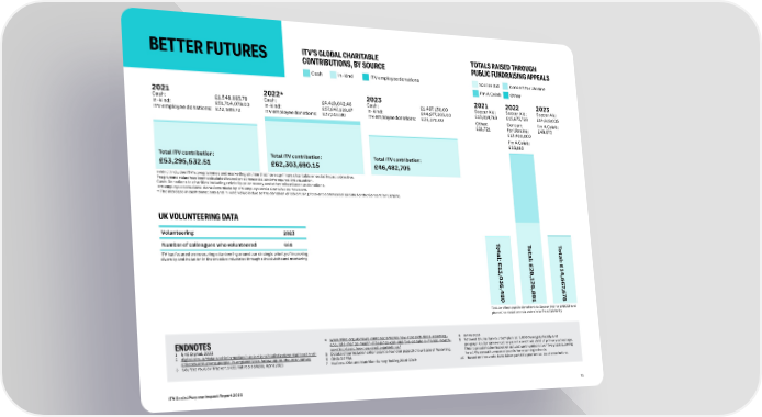 BETTER FUTURES ITV’S GLOBAL CHARITABLE TOTALS RAISED THROUGH CONTRIBUTIONS, BY SOURCE PUBLIC FUNDRAISING APPEALS Cash In-kind ITV employee donations Soccer Aid Concert for Ukraine I’m A Celeb Other 2021 2022* 2023 2021 2022 2023 Cash: £1,548,863.79 Cash: £4,419,042.48 Cash: £1,467,130.00 Soccer Aid: Soccer Aid: Soccer Aid: In-kind: £51,714,079.00 In-kind: £57,847,128.87 In-kind: £44,977,205.00 £13,014,769 £15,673,728 £14,619,005 ITV employee donations: £32,589.72 ITV employee donations: £37,518.80 ITV employee donations: £38,370.00 Other: Concert I’m A Celeb: £21,721 for Ukraine: £48,673 £13,400,000 I’m A Celeb: £53,163 Total ITV contribution: Total ITV contribution: Total ITV contribution: £53,295,532.51 £62,303,690.15 £46,482,705 In kind: includes ITV’s programmes and marketing airtime that have a primary charitable or social impact objective. Programme value has been calculated based on commercial airtime equivalent valuation. Cash: Donations to charities including celebrity prize money and other miscellaneous donations. ITV employee donations: donations made by ITV employees via CAF Give As You Earn. * The increase in cash donations and in-kind value is due to the donation of advertising fees and commercial airtime for the Concert for Ukraine. UK VOLUNTEERING DATA Volunteering 2023 Number of colleagues who volunteered 668 T T T ot o o ITV has focused on measuring volunteering around our strategic priority of improving al t t a a diversity and inclusion in the creative industries through school visits and mentoring : l l: £ : £ £ 1 2 1 3 9 4 , 0 , , 3 1 66 6 26 7 , , , 4 8 6 9 9 7 0 1 8 Totals reflect public donations to Soccer Aid for UNICEF and phoneline donations via votes in to I’m a Celebrity ENDNOTES 4 www.mind.org.uk/news-campaigns/news/new-research-finds-watching- 8 BARB 2023 accurate-mental-health-storylines-can-improve-people-s-mental-health- 9 National Online Survey | Sample size: 3,000 demographically and 1 NHS Digital, 2023 as-mind-launches-new-media-guidelines/ geographically representative parents and their child of primary school age. 2 digital.nhs.uk/data-and-information/publications/statistical/mental-health-of- 5 Details of our inclusion criteria can be found on page 19 of our Basis of Reporting. This is an estimation based on actual pupil numbers over five years allowing children-and-young-people-in-england/2021-follow-up-to-the-2017-survey 6 ONS/DEFRA for a 14% annual turnover of pupils for returning schools 3 Source: YouGov Tracker, 1,011 nat rep sample, April 2023 7 National Diet and Nutrition Survey Rolling 2016-2019 10 Based on those who have taken part this year and at least once before. ITV Social Purpose Impact Report 2023 70