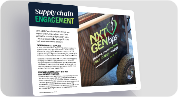 Supply chain ENGAGEMENT 80% of ITV’s emissions sit within our supply chain, making our suppliers critical to our decarbonisation plan. This is why we make every effort to include them on our journey. ENGAGING WITH KEY SUPPLIERS In 2023, we expanded our supplier engagement programme by inviting over 250 suppliers to submit climate-related information to the Carbon Disclosure Project (CDP). Our response rate to CDP increased from around 50% to around 60% and we are seeing good progress by many of our key suppliers. We continue to collaborate with our UK broadcasting peers to engage our shared supply chains. In 2023, we jointly engaged targeted supplier groups to help accelerate their sustainability maturity. In 2024, we will continue with our targeted engagement approach and look to provide more support for SMEs in our supply chain. EMBEDDING SUSTAINABILITY INTO OUR PROCUREMENT PROCESSES Sustainability is embedded into our procurement processes and contracting terms, with 20% of the selection criteria for key contracts dedicated to Social Purpose. We are also considering sustainability earlier in projects by incorporating sustainability considerations into project design. This progress means supplier selection and investment decisions Battery Generator are increasingly being influenced by sustainability factors. ITV Social Purpose Impact Report 2023 26