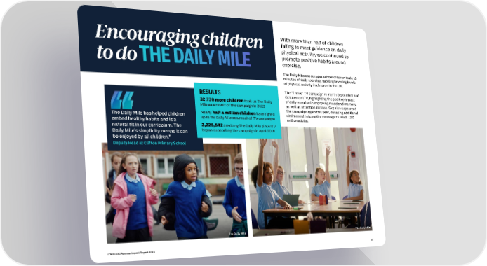 With more than half of children Encouraging children failing to meet guidance on daily physical activity, we continued to promote positive habits around to do THE DAILY MILE exercise. The Daily Mile encourages school children to do 15 minutes of daily exercise, tackling lowering levels of physical activity in children in the UK. RESULTS The “Thrive” TV campaign re-ran in September and October on ITV, highlighting the positive impact 32,730 more children took up The Daily of daily exercise in improving mood and memory, Mile as a result of the campaign in 2023 as well as attention in class. Sky also supported Nearly half a million children have signed the campaign again this year, donating additional The Daily Mile has helped children up to the Daily Mile as a result of ITV campaigns airtime and helping the message to reach 12.9 embed healthy habits and is a million adults. natural fit in our curriculum. The 2,225,542 are doing The Daily Mile since ITV Daily Mile’s simplicity means it can began supporting the campaign in April 2018 be enjoyed by all children.” Deputy Head at Clifton Primary School The Daily Mile The Daily Mile ITV Social Purpose Impact Report 2023 56
