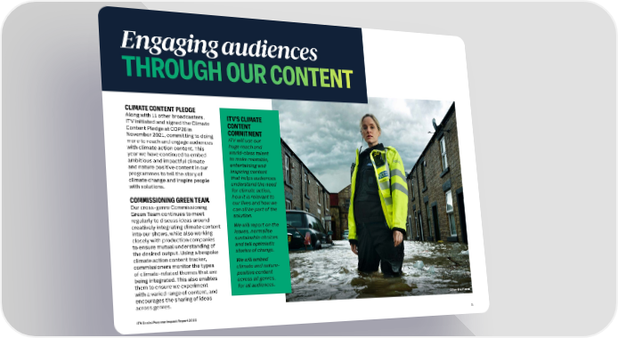 Engaging audiences THROUGH OUR CONTENT CLIMATE CONTENT PLEDGE Along with 11 other broadcasters, ITV’S CLIMATE ITV initiated and signed the Climate CONTENT Content Pledge at COP26 in COMMITMENT November 2021, committing to doing ITV will use our more to reach and engage audiences huge reach and with climate action content. This world-class talent year we have continued to embed to make relatable, ambitious and impactful climate entertaining and and nature positive content in our inspiring content programmes to tell the story of that helps audiences climate change and inspire people understand the need with solutions. for climate action, COMMISSIONING GREEN TEAM how it is relevant to Our cross-genre Commissioning our lives and how we Green Team continues to meet can all be part of the regularly to discuss ideas around solution. creatively integrating climate content We will report on the into our shows, while also working issues, normalise closely with production companies sustainable choices to ensure mutual understanding of and tell optimistic the desired output. Using a bespoke stories of change. climate action content tracker, We will embed commissioners monitor the types climate and nature- of climate-related themes that are positive content being integrated. This also enables across all genres, them to ensure we experiment for all audiences. with a varied range of content, and encourages the sharing of ideas After the Flood across genres. ITV Social Purpose Impact Report 2023 31