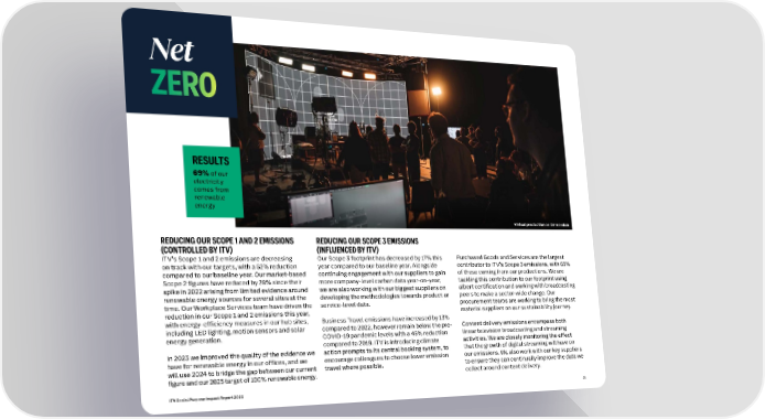 Net ZERO RESULTS 69% of our electricity comes from renewable energy Virtual production on Emmerdale REDUCING OUR SCOPE 1 AND 2 EMISSIONS REDUCING OUR SCOPE 3 EMISSIONS (CONTROLLED BY ITV) (INFLUENCED BY ITV) ITV’s Scope 1 and 2 emissions are decreasing Our Scope 3 footprint has decreased by 17% this Purchased Goods and Services are the largest on track with our targets, with a 52% reduction year compared to our baseline year. Alongside contributor to ITV’s Scope 3 emissions, with 65% compared to our baseline year. Our market-based continuing engagement with our suppliers to gain of these coming from our productions. We are Scope 2 figures have reduced by 28% since their more company-level carbon data year-on-year, tackling this contribution to our footprint using spike in 2022 arising from limited evidence around we are also working with our biggest suppliers on albert certification and working with broadcasting renewable energy sources for several sites at the developing the methodologies towards product or peers to make a sector-wide change. Our time. Our Workplace Services team have driven the service-level data. procurement teams are working to bring the most reduction in our Scope 1 and 2 emissions this year, material suppliers on our sustainability journey. with energy-efficiency measures in our hub sites, Business Travel emissions have increased by 13% including LED lighting, motion sensors and solar compared to 2022, however remain below the pre- Content delivery emissions encompass both energy generation. COVID-19 pandemic levels with a 45% reduction linear television broadcasting and streaming compared to 2019. ITV is introducing climate activities. We are closely monitoring the effect In 2023 we improved the quality of the evidence we action prompts to its central booking system, to that the growth of digital streaming will have on have for renewable energy in our offices, and we encourage colleagues to choose lower emission our emissions. We also work with our key suppliers will use 2024 to bridge the gap between our current travel where possible. to ensure they can continually improve the data we figure and our 2025 target of 100% renewable energy. collect around content delivery. ITV Social Purpose Impact Report 2023 25