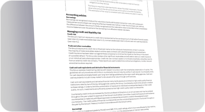 206 ITV plc Annual Report and Accounts 2023 ITV plc Annual Report and Accounts 2023 207 F I NOTES TO THE FINANCIAL STATEMENTS NAN SECTION 4: CAPITAL STRUCTURE AND FINANCING COSTS CONTINUED C I AL Currency and 4.2 Borrowings Keeping The Group borrows money from financial institutions in the form of bonds, bank S 1 January non-cash 31 December T Acquisitions** it simple facilities and other financial instruments. The interest payable on these instruments A 2022 Net cash flow movements 2022 T £m £m £m £m £m is shown in the net financing costs note (note 4.4). E M Loans and facilities due within one year (290) (19) 257 (237) (289) E There are Board-approved policies in place to manage the Group’s financial risks. N T Loans and facilities due after one year (732) – – 191 (541) Macroeconomic market risks, which impact currency transactions and interest S Total loans and facilities (1,022) (19) 257 (46) (830) rates, are discussed in note 4.3. Credit and liquidity risks are set out below. • Credit risk: the risk of financial loss to the Group if a customer or counterparty Currency component of forwards and swaps (36) – – 27 (9) fails to meet its contractual obligations held against euro denominated bonds • Liquidity risk: the risk that the Group will not be able to meet its financial Lease liabilities (92) – 26 (66) (132) obligations as they fall due Total debt (1,150) (19) 283 (85) (971) The Group is required to disclose the fair value of its debt instruments. The fair value is the amount the Group would pay a third party to transfer the liability. * Restricted cash 50 – (50) – – This estimation of fair value is consistent with instruments included in note 4.5. Cash 246 – 5 6 257 Accounting policies Cash equivalents 440 – (355) 6 91 Borrowings * Borrowings are recognised initially at fair value less directly attributable transaction costs, with subsequent Total cash and cash equivalents 686 – (350) 12 348 measurement at amortised cost using the effective interest rate method. Under the amortised cost method, Net debt (414) (19) (117) (73) (623) the difference between the amount initially recognised and the redemption value is recorded in the Consolidated Income Statement over the period of the borrowing on an effective interest rate basis. * On 1 January 2022, £50 million of cash was presented as restricted in favour of the commitments under the asset-backed pension agreements. This balance was £nil at 31 December 2022 given the restriction was removed in the year and the cash replaced with a surety bond. Managing credit and liquidity risk ** Loans on acquisition included £98 million for Plimsoll Productions and £4 million for Lingo Pictures. The Plimsoll Productions loan was reduced by £83 Credit risk million, which was repaid as part of the acquisition using cash raised from the Group’s subscription for new shares. This £83 million was treated as a cash The Group’s maximum exposure to credit risk is represented by the carrying amount of derivative financial assets outflow on acquisition rather than a repayment of debt. (see note 4.3), trade receivables (see note 3.1.3), contract assets (see note 3.1.6) and cash and cash equivalents Loans and facilities due within one year (see note 4.1). The €259 million Eurobond was repaid in December 2023. The sterling-equivalent repayment value, totalling Trade and other receivables £233 million, had been hedged using forward exchange contracts. The Group’s exposure to credit risk is influenced mainly by the individual characteristics of each customer. Loans and loan notes due after one year The majority of trade receivables relate to airtime sales contracts with advertising agencies and advertisers. In January 2022, the Group entered into a new syndicated £500 million Revolving Credit Facility (RCF) to meet Credit insurance has been taken out against these companies to minimise the impact on the Group in the event short-term funding requirements. The original terms of the RCF ran until January 2027; however, the Group took of a possible default. The Group also reviews other significant receivables and will seek to take out credit insurance the opportunity to request an extension for one year on the first and second anniversary of the facility. As a result, on an individual basis where appropriate. Credit risk over contract assets is monitored proactively using daily reports £83 million of the £500 million RCF matures in 2028 and £417 million matures in January 2029. The RCF was from an external credit risk company. These reports are used to determine contractual obligations, monitor risk and undrawn as at 31 December 2023 (2022: £50 million drawn). amend terms where required. The Group has a €600 million Eurobond in issue at a fixed coupon of 1.375%, which matures in September 2026 Cash and cash equivalents and derivative financial instruments and has been swapped back to sterling (£533 million) using a number of cross-currency interest rate swaps. The Group operates investment guidelines with respect to surplus cash that emphasise preservation of capital. The The resulting fixed rate payable in sterling is c.2.9%. guidelines set out procedures and limits on counterparty risk and maturity profile of cash placed. Counterparty limits for cash deposits are largely based upon long-term ratings published by the major credit rating agencies. Cash and A new £230 million term loan was taken out in the year, and was fully drawn-down in December 2023 in order to cash equivalents include money market funds valued at fair value through profit and loss. repay the €259 million Eurobond. The term loan matures in July 2027. Interest on the loan is determined as an Cash and cash equivalents and derivative financial instruments exposure is limited to high credit quality financial aggregate of compounded SONIA plus a margin. institutions rated by two of the key rating agencies used by the Group. Counterparty credit 