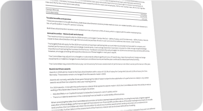 134 ITV plc Annual Report and Accounts 2023 ITV plc Annual Report and Accounts 2023 135 REMUNERATION REPORT CONTINUED G O VE R NAN Restricted Share awards made in 2023 – Audited Remuneration Policy application in 2024 C On 28 March 2023 awards were made under the ITV plc Executive Share Plan (the ITV ESP) to Carolyn McCall and Chris Kennedy as set out Executive Directors E below. The following section provides details of how the Policy will be implemented in 2024. Number of Salary share options Performance Performance measure% salary awarded(nil cost)1Value at award date period endsHolding periodRelease date Salaries are paid in line with the Policy. Both Executive Directors received an increase of 3% from 1 January 2024 which is in line with other Carolyn McCall132.51,643,105£1,338,80228 March 20262 years28 March 2028senior executives, but below the 5-6% increase applied for the majority of employees. When considering salary increases for the wider Chris Kennedy112.5998,114£813,26328 March 20262 years28 March 2028workforce, the overall aim was to provide all employees with a meaningful increase to their base salary which reflected the broader economic 1. Nil cost options were granted based on the average share price on the three trading days preceding the award which was 81.48 pence. context. While the high inflationary environment was impacting all employees, it was recognised that lower paid employees were being impacted more acutely. Salary increases for the more senior roles were reduced to help fund more meaningful increases for employees at lower pay levels. The salary increases therefore were scaled from 6% for lower paid employees, 5% for mid-low tier roles, 4% for mid-high tier The awards are over restricted shares with grant levels reduced by 50% compared to the annual LTIP awards granted in previous years. roles and 3% for the more senior executives. Awards will normally vest after three years following the date of award subject to the satisfaction of a performance underpin assessed at 2024 Salary 31 December 2025. As the awards have a performance underpin, there are no performance condition weightings applicable, nor is there a Carolyn McCall £1,040,729 threshold-max vesting range. Any vested awards would then be subject to a two year holding period.Chris Kennedy £744,587 For the awards granted in 2023, the Committee will retain the ability to reduce vesting of the Restricted Shares (including to nil) where:Taxable benefits and pension • Adjusted Return on Capital Employed is below the Company’s cost of capital; and/or These are provided in line with the Policy. Both Executive Directors receive private medical cover, car-related benefits, and a cash allowance in lieu of participation in any ITV pension scheme. • There is a material weakness in the underlying financial health or sustainability of the business Both Executive Directors receive a cash allowance in lieu of pension of 9% of salary, which is aligned with the wider employee group. When assessing the latter, the Committee will consider all factors deemed relevant at the time, including for example, progress against execution of the strategy, performance against financial and non-financial KPIs and the nature of the wider trading environment. In line with Annual Incentive – Bonus (cash and shares) best practice, the Remuneration Committee will retain the discretion to adjust any incentive awards where vesting outcomes are considered The maximum bonus opportunity for 2024 remains unchanged: Carolyn McCall – 180% of salary; and Chris Kennedy – 165% of salary. Awards to be inappropriate. Further detail on the assessment of the performance underpin will be disclosed at the time of vesting in 2026.made to Executive Directors through the bonus will be paid two-thirds in cash and one-third deferred into shares under the DSA. As a further safeguard malus and clawback provisions may be operated at the discretion of the Committee in respect of any element of these The targets that will apply for the 2024 annual bonus have been set taking into account internal and external forecasts for company and awards. Under malus, unvested share awards (including any portion of the award subject to a post-vesting holding period) can be reduced market performance and continued strategic investments. Cost savings objectives have been included for 2024, recognising the strategic (down to zero if considered appropriate) or be made subject to additional conditions. Clawback allows for repayment of shares previously importance of reshaping the business for the future. The Board considers the actual targets for 2024 to be commercially sensitive at this time, received following vesting or release from a holding period if applicable. Malus/clawback can be operated up to six years from the relevant date however, envisage providing retrospective disclosure of these targets in next year’s report. of grant for Restricted Share awards. The circumstances in which the operation of these provisions would be applied may be considered from time to time but currently include material misstatement of financial results, gross misconduct or fraud and material reputational damage. The Committee may adjust bonus targets or outcomes to reflect significant one-off events (e.g. major transactions), foreign exchange The Committee maintains sufficient scope in the ITV ESP rules to exercise discretion and judgement in line with the spirit of the Code.movements or material changes to assumed plan conditions to ensure that the plan continues to reward performance fairly. Chair and Non‑executive Directors – AuditedThe Committee may amend the bonus pay-out should any formulaic assessment of performance not reflect overall performance in the year. The table below sets out in a single figure the total remuneration for Non-executive Directors for the financial year. The annual fee for the Chair was £400k which is unchanged from appointment. For 2023 , t