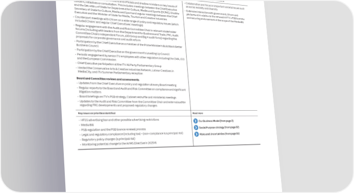 88 ITV plc Annual Report and Accounts 2023 ITV plc Annual Report and Accounts 2023 89 STAKEHOLDER ENGAGEMENT CONTINUED G O VE R NAN C LEGISLATORS AND REGULATORS PROGRAMME PARTICIPANTS E Description Link to strategic priorities Description Link to strategic priorities The Board is committed to its responsibility as a public service broadcaster (PSB) and conducting Availability of viewer content: The safety of participants is of paramount importance to the Board. The Board takes its duty of Expand Studios globally: business in line with the appropriate laws and regulation, to ensure we operate in an ethical and see Our Strategy care to them very seriously, and obtains regular assurance over the support and processes in see Our Strategy responsible way. place to safeguard their physical and mental health and wellbeing. ITV’s approach to risk management is led from ITV Plc Board level, assisted by specialists who drive good practice within Forms of engagement Outcomes and impact on principal decisions the business. ITV production teams are trained in the identification and management of health Meetings and presentations • Collaboration and focus on important societal issues such and safety risks, and in producing programme-specific risk assessments. Our continuous review • Meetings with government ministers and officials and shadow ministers on key issues of as social mobility and diversity of risk involves our central risk support team and external experts as required, in considering all concern, initiatives or consultation. This includes meetings between the Chief Executive • Extensive interaction with government, Ofcom and stages of the production process, including pre-filming screening, care during production, and and the Secretary of State for Department for Culture, Media and Sports (DCMS), Shadow parliament in relation to the renewal of ITV’s PSB licences aftercare of participants after filming and broadcast. Secretary of State for Culture, Media and Sport and regular meetings between the Chief and securing endorsement of the scope of the Media Bill Executive and the Minister of State for Media, Tourism and Creative Industries Forms of engagement Outcomes and impact on principal decisions • Counterpart meetings with Ofcom on a wide range of policy and regulatory issues (which Meetings and presentations • Observation of the mental health protection of Love Island included Chairs’ and regular Chief Executives’ meetings) (series 9) programme participants conducted by an • Chief Executive attendance at Mental Health Advisory Group (MHAG) meeting, which three • Regular engagement with the Audit and Risk Committee Chair in relevant stakeholder other Management Board members regularly attend (two of whom are members of the Independent Consultant Clinical Psychologist forums (including with leaders from the Department for Business and Trade, FRC, Audit Advisory Group) throughout the year • Formal Social Media guideline introduced to protect Love Committee Chairs Independent Forum, 100 Group and Big 4 audit firms) regarding the Island participants and their families from the adverse proposals for corporate governance and audit reform • Chief Executive chairs the Duty of Care Operating Board which includes Management Board members and is attended by specialist advisers including ITV’s Independent Chief effects of social media • Participation by the Chief Executive as a member of the Prime Minister’s Build Back Better Medical Officer and Independent Consultant Clinical Psychologist and, on behalf of the • Meetings with mental health advisers who support ITV Business Council Board, the Chair of the Audit and Risk Committee productions on-set to ensure there was clarity of roles and • Participation by the Chief Executive on the government’s Levelling Up Council • Annual duty of care presentation to the Audit and Risk Committee, which in 2023 was accountabilities especially with regards to healthcare • Periodic engagement by senior ITV employees with other regulators including the CMA, ICO attended by the Chair and other members of the Board of Directors regulatory, privacy and ethical obligations and the European Commission • An annual review of ITV’s guidance on protecting • Chief Executive participation at the ITV All Party Parliamentary Group Board and Committee reviews and assessments programme participants and contributors • Hosted the Conservative Arts & Creative Industries Network, Labour Creatives in • Regular Board updates on duty of care processes and issues, and on the Duty of Care • Participant Aftercare Programme (PAP) is a company- MediaCity, and ITV Summer Parliamentary reception Operating Board’s discussions and activities (including feedback from ITV’s Mental Health funded counselling service, extended to offer support to Advisory Group and updates on the ITV2/CALM partnership), through updates from the participants under 18, and to News, Daytime, Scripted, and Board and Committee reviews and assessments Audit and Risk Committee Chair, who is a standing attendee of the Duty of Care Continuing Drama productions • Updates from the Chief Executive on policy and regulation at every Board meeting Operating Board • Developed standards and vetting procedure for engaging • Regular reports to the Board and Audit and Risk Committee on compliance and significant • Appointment of an Independent Chief Medical Advisor and an Independent Consultant mental health advisers to support productions litigation matters Clinical Psychologist to ITV • In an industry first, ITV initiated a training programme in • Board briefings on ITV’s PSB strategy, Cabinet reshuffle and ministerial meetings • Board review of progress against ITV’s Diversity Acceleration Plan to accelerate change in partnership with the BBC, and approved by the British diversity and inclusion on screen Psychological Society, to build capacity of registered • 
