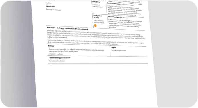 68 ITV plc Annual Report and Accounts 2023 ITV plc Annual Report and Accounts 2023 69 S CLIMATE RELATED FINANCIAL DISCLOSURES CONTINUED T R A T E G I C R 2. INCREASED COSTS IN THE TRANSITION TO A LOW CARBON WORLD3. RESILIENCE OF PRODUCTIONS TO EXTREME WEATHER EVENTS E P O Context Current policies Expenditure increase – minimalContext Current policies Expenditure Increase – moderate R (3°C+) (3°C+) T All businesses will face costs associated with the transition to Net The Current Policies’ scenario assumes that no carbon pricing If governments and organisations fail to adequately respond to An increase in the frequency and severity of extreme weather Zero and a low carbon economy. Carbon emissions taxation is being (High carbon is introduced and therefore the increased costs are limited as climate change, we are likely to see an increase in physical climate (High carbon events will result in costs associated with adapting our imposed by more nations worldwide to limit and reduce carbon scenario impact) it stays business as usual.risks, such as extreme weather events. scenario impact) approach to how we film, travel and maintain business intensive activities causing climate change.Extreme weather events have the capacity to significantly impact operations as well as challenges to obtaining insurance. We We may be exposed to increased costs of operating in all areas of ITV productions. This may result in operational interruption resulting do however continue to evolve our resilience and continuity our business. This could come from increased environmental in delay in delivering content, meeting consumer contracts and plans to ensure they can respond to extreme weather events. SDS (2°C+)Expenditure increase – moderate regulation, carbon pricing or emissions taxation, investment in low unforeseen costs. SDS (2°C+) Expenditure Increase – minimal to moderate carbon technologies as well as throughout our supply chain. In (Low carbon Increased costs may be felt from the wider transition to a low addition, shifts in supply and demand due to climate related impacts scenario impact)carbon economy. However, the SDS scenario does not provide Time horizon(Low carbon The world is already experiencing the impacts of extreme may result in ITV not being able to source materials for production an indication of how government or regulation may intervene Mediumscenario impact)weather events globally, and whilst the frequency and severity due to costs.in this area. of these events under this scenario is assumed to be Impact Area manageable, we anticipate we will feel these impacts more, Time horizonNZE by 2050 Expenditure increase – moderateExpenditure increase with some corresponding financial consequences. Medium(1.5°C+) Increased costs may be felt from wider transitions to a low NZE by 2050 Expenditure Increase – minimal Impact Area (Very low carbon carbon economy. Highest impact expected in terms of (1.5°C+) scenario impact)increased costs passed on through the supply chain. As the world is already experiencing the impacts of extreme Expenditure increase (Very low carbon weather events globally, the increase in frequency and scenario impact) severity of these events in this scenario is assumed to be manageable within ITV’s existing business continuity How we are building our resilience to a 2 oC or less scenario procedures. We are actively seeking to limit the amount of carbon we emit in our business. We continue to focus on increasing our use of renewable energy, assessing the How we are building our resilience to a 2 oC or less scenario maturity of our suppliers in relation to managing climate related risks and partnering with peers to support an industry-wide transition approach. Examples of how we are building our resilience include:Within the international ITV Studios business, the environment and potential weather events are key considerations when making decisions on filming • Consolidating our London offices from three sites to two;locations and as part of risk assessments. Should a situation arise, we would respond on a case-by-case basis, supported by our existing business continuity • Focusing our office and productions investment on improving resiliencemeasures, which include insurance, evacuation protocols to ensure we keep talent and crew safe, and sourcing alternative filming locations. This resilience and agility continue to be tested. • Adopting a centralised approach to procuring and maintaining electric vehicles and the supporting infrastructure. We have implemented a Weather Notification System to enhance our response to extreme weather events. Including real time monitoring of meteorological • Transitioning to the cloud, using partners aligned to our Net Zero targets and data centres powered by renewable energydata, customised alerts tailored to production areas, and direct notifications to allow for proactive awareness. Metrics Targets Metrics Targets • Scope 1, 2 and 3 footprint; • 46.2% reduction of scope 1 and 2 by 2030; 28% reduction of • Data on cost of damage from extreme weather events (by geography), to assess our • Targets being developed • percentage of our electricity coming from a renewable energy tariff;scope 3 by 2030 (base year 2019); exposure to the risk and the priority areas • number of key suppliers aligned with our targets• 100% of our electricity coming from renewable tariff by • Insurance captives 2025; • 100% of our key suppliers aligned with our targets by 2025.Link to existing principal risk Link to existing principal riskOperational Resilience. Not currently linked to a principal risk. However, it is linked to our climate emerging risk.