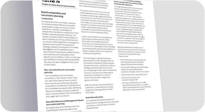 104 ITV plc Annual Report and Accounts 2023 ITV plc Annual Report and Accounts 2023 105 NOMINATIONS COMMITTEE REPORT CONTINUED G O VE R NAN Board searches Set out below are the objectives of our Maintain at least 30% female Directors on Maintain at least 10% Directors who are Ensure the Non-executive Director search C BOARD DIVERSITY The Committee approved the appointment Board Diversity Policy and our assessment the Board over the short to medium term People of Colour on the Board over the pool is sufficiently wide and covers E of SRI/Mission Bay for the search for a of performance against them. These As at 31 December 2023, the Board had short to medium term candidates who are People of Colour and 45.45% Non‑executive Director with specialised objectives ensure that both appointments 45.45% female representation, including one As at 31 December 2023, the Board had candidates with a wide range of expertise, creative industry skills experience and Lygon and succession planning support the Executive Director and two Committee 18.18% representation of People of Colour skills and backgrounds, and that shortlists female Board representation Group for the search for a Non‑executive development of a diverse pipeline. Chairs. We have therefore exceeded the with two Directors represented on the Board. include at least 50% female candidates In line with Parker Review, the Listing Director with financial expertise. Other than target of 40% of women on the Board set by We therefore also comply with the When conducting a Non-executive Director the provision of search services, neither SRI/ Ensure ITV has a development pipeline of ITV and the FCA Listing Rules, as well as the recommendation of the Parker Review and search, the Committee works closely with Rules and Hampton‑Alexander Review Mission Bay or Lygon Group have any other high calibre senior executive candidates Hampton-Alexander target of 33%. Whilst the FCA Listing Rule requirement to have at the executive search agency to compile a recommendations connection with the Company or any and encourage senior executives to obtain the Board recognises that an effective Board least one director of colour on the Board. long and shortlist of candidates made up of individual director. SRI/Mission Bay had external board experience with broad strategic perspective requires at least 50% female candidates as well as 18.18% previously supported the recruitment of The ongoing development of senior leaders, diversity, ultimately the Board appoints Use search firms who have signed up to the candidates from various backgrounds and Non‑executive Directors to the Board. to ensure we retain the best talent to candidates based on merit and assesses Voluntary Code of Conduct on gender industries, including People of Colour. People of Colour Board representation broaden their skill sets and experience to potential Directors against measurable, diversity Candidates were identified and interviewed The specifications for both vacancies set prepare them for future senior roles, is objective criteria. The Board supports the provisions of the and their skills and qualities were assessed out the agreed key skills, experience and important to us. ITV runs a high potential Voluntary Code of Conduct for Executive against measurable, objective criteria. Board composition and character profile being sought to fit with the leadership programme, building a pipeline of Our principles for Board diversity also apply Search Firms which addresses gender succession planning current balance, membership and dynamics diverse talent for senior level roles. The Rise to our Management Board and senior diversity on corporate boards and best ANDREW COSSLETT of the Board and were approved by the Programme launched in 2020 continues to management below this level. We are practice for related search processes. Both CHAIR Composition Committee. As in prior years, the Committee promote People of Colour talent progression therefore pleased that the FTSE Women 7 March 2024 During the year, the Committee undertook executive search agencies used in 2023 for focused on diversity as part of the selection at the manager level by providing People of Leaders Review ranked ITV third out of the our Non-executive Directors are signatories an analytical review of Board composition, criteria, selecting the highest calibre Colour colleagues greater visibility with FTSE 250 and top of the Media sector for to the Code. assessing the range and balance of skills, candidates for appointment to the Board, senior leaders through networking and representation of women in leadership, with experience, diversity, knowledge and based on merit and objective criteria. sponsorship, alongside career coaching. 52.4% women in the Combined Executive independence to identify any gaps and inform The programme also works with managers Committee and Direct Reports. the Non‑executive Director searches. The In each case a shortlist of candidates was and Senior Leadership Team advocates to review concluded that the representation of interviewed by all the members of the build race confidence and accelerate an Board diversity was strong and the Directors Nominations Committee (led by the inclusive culture change at ITV. as a whole had the right skills, knowledge and Chairman), the Chief Executive and Group experience to enable ITV to execute its CFO and COO. Following this, the Committee Bespoke development initiatives are in Listing Rule 9.8.6R (10) strategy. However, the departure of Sir Peter recommended the appointments of Marjorie place for senior executives who have been In accordance with Listing Rule 9.8.6R (10), our gender and ethnicity data in the format set out in LR9 Annex 2.1 as at 31 December 2023 is set Bazalgette in 2022 meant there was a Kaplan and Dawn Allen, which the Board identified as potential successors, based out below. requirement for specialised creative industry subsequently approved. on particular de