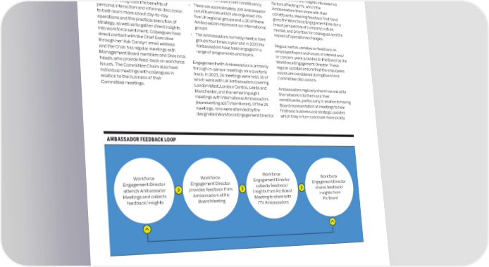94 ITV plc Annual Report and Accounts 2023 ITV plc Annual Report and Accounts 2023 95 G ENGAGING WITH OUR WORKFORCE O VE R NAN The Board ensures effective engagement The Workforce Engagement Director also Ambassadors were asked to gather feedback Our Ambassador network C with the workforce using two of the methods Our Ambassador network was established in joined the first (since 2019) in-person from their constituents about awareness, E stipulated under the Code: a designated 2015 and represent colleagues’ interests in Ambassador Forum in Autumn 2023 which knowledge and trust in the Speaking Up Workforce Engagement Director, and a all parts of the Group, shares information was attended by over 80 Ambassadors (UK process and channels. Whilst the majority formal workforce advisory panel (our and helps inform our culture by giving our and International). were aware of the policy and Speak Up Ambassador network). Edward Bonham colleagues a voice. channels, Ambassadors indicated that there Carter had the role from 2019 and was The active two-way dialogue and attendance are varying levels of awareness, confidence succeeded by Graham Cooke in June 2023. • Each Ambassador usually represents at Ambassador meetings also provides an and trust in the process. This will be The Board extends its thanks to Edward for approximately 50 colleagues from their opportunity to share insights into external addressed in the 2024 Q1 Ambassador his valuable contributions. business area, called their constituency factors affecting ITV, which the meetings with a planned in-depth and Ambassadors then share with their practical session to raise awareness and The Board recognises the benefits of • There are approximately 100 Ambassador constituents. Hearing feedback first hand trust in the Speak Up process. The intention personal interaction and informal discussion constituencies which are organised into gives the Workforce Engagement Director a is that the Ambassadors will then be well to both learn more about day-to-day five UK regional groups and c.20 of these broad perspective of company culture, equipped to support their local constituents operations and the practical execution of Ambassadors represent our international morale, and priorities for colleagues and the in understanding the importance of raising strategy, as well as to gather direct insights groups impact of operational changes. concerns via our Speak Up channels. into workforce sentiment. Colleagues have • The Ambassadors normally meet in their direct contact with the Chief Executive groups four times a year and in 2023 the Regular verbal updates on feedback on The Ambassadors were given an overview through her ‘Ask Carolyn’ email address Ambassadors have been engaged in a employee topics and issues of interest and/ of the Engagement and Culture survey and and the Chair has regular meetings with range of programmes and topics. or concern, were provided to the Board by the Mandatory Training and were asked to Management Board members and Divisional Workforce Engagement Director. These encourage their constituents to complete heads, who provide feed-back on workforce Engagement with Ambassadors is primarily regular updates ensure that the employees both the survey and mandatory training. issues. The Committee Chairs also have through in-person meetings on a quarterly voices are considered during Board and The Ambassadors were updated on the new, individual meetings with colleagues in basis. In 2023, 24 meetings were held, 16 of Committee discussions. staggered approach to mandatory training relation to the business of their which were with UK Ambassadors covering and its importance and were asked for Committee meetings. London West, London Central, Leeds and Ambassadors regularly share how valuable feedback and to work with local managers Manchester, and the remaining eight the network is to them and their to ensure full completion in their areas. meetings with international Ambassadors constituents, particularly in relation to having The headline results from the engagement (representing all ITV territories). Of the 24 Board representation at meetings to hear and culture survey were shared with the meetings, nine were attended by the firsthand business and strategic updates Ambassadors and they gave their initial designated Workforce Engagement Director. which they in turn can share more locally. reactions. The Ambassadors have been asked to play a proactive role, partnering with their local line managers; to share, What were the takeaways The Ambassadors have been engaged and explore and agree actions based on local AMBASSADOR FEEDBACK LOOP updated on the ITV Together programme results; and to record local actions on a from Ambassador meetings central IT platform. during 2023? (Oracle Fusion), with the programme team having regularly sought feedback from What are the key areas of focus 2023 has again been a year of change for Ambassadors and their constituencies to colleagues, with an ongoing focus on digital, inform their plans for the initial launch and for engagement in 2024? organisational and strategic transformation. stabilisation period, as well as shaping future The Workforce Engagement Director will Workforce Throughout the year the Ambassadors have communications and engagement activity. continue to attend Ambassador meetings Workforce Workforce Engagement Director Workforce been updated on the More Than TV strategy, This led to the introduction of local super- Engagement Director Engagement Director Engagement Director to engage on important topics, such as collects feedback/ with particular focus on ITVX during its users to champion and support new Speaking Up, ITV’s digital transformation, attends Ambassador provides feedback from insights from Plc Board shares feedback/ launch year, they were asked to share processes and minimise workarounds. Meetings and collects Ambassadors at Plc insights from action planning linked to 