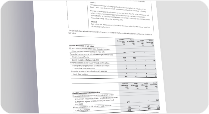 218 ITV plc Annual Report and Accounts 2023 ITV plc Annual Report and Accounts 2023 219 F I NOTES TO THE FINANCIAL STATEMENTS NAN SECTION 4: CAPITAL STRUCTURE AND FINANCING COSTS CONTINUED C I AL 4.4 Keeping This section details the interest income generated on the Group’s cash and other 4.5 Keeping The financial instruments included in the Consolidated Statement of Financial S T it simple financial assets and the interest expense incurred on borrowings and other it simple Position are measured at either fair value or amortised cost. The measurement of A Net financing Fair value T financial liabilities. this fair value can in some cases be subjective, and can depend on the inputs used in E costs hierarchy M the calculations. The Group generally uses external valuations using market inputs or E In reporting ‘adjusted profit’, the Group adjusts net financing costs to exclude N market values (e.g. external share prices). The different valuation methods are called T unrealised mark-to-market movements on interest rate and foreign exchange ‘hierarchies’ and are described below. S derivatives, gains/losses on bond buybacks, net pension interest, interest and fair value movements in acquisition-related liabilities and other financing costs. Level 1 Our rationale for adjustments made to financing costs is set out in the Fair values are measured using quoted prices (unadjusted) in active markets for Finance Review. identical assets or liabilities. Level 2 Accounting policies Fair values are measured using inputs, other than quoted prices included within Net financing costs comprise interest income on funds invested, gains/losses on the disposal of financial instruments, Level 1, which are observable for the asset or liability either directly or indirectly. changes in the fair value of financial instruments, interest expense on borrowings, unwinding of the discount on Interest rate swaps and options are accounted for at their fair value based upon exit provisions, unwinding of the discount on liabilities to non-controlling interest, foreign exchange gain/losses, and prices at the current reporting period. Forward foreign exchange contracts are imputed interest on pension assets and liabilities. Interest income and expense is recognised as it accrues in profit accounted for at the difference between the contract exchange rate and the quoted or loss, using the effective interest method. forward exchange rate at the reporting date. Net financing costs Level 3 Net financing costs can be analysed as follows: Fair values are measured using inputs for the asset or liability that are not based on observable market data. 2023 2022 £m £m The tables below set out the financial instruments included on the Consolidated Statement of Financial Position at Financing income fair value: Interest income 14 9 Foreign exchange gain 2 3 Fair value Level 1 Level 2 Level 3 31 December 31 December 31 December 31 December Pension interest income (see note 3.7) 9 – 2023 2023 2023 2023 Other finance income – 1 £m £m £m £m 25 13 Assets measured at fair value Financial instruments at fair value through reserves Financing costs Other pension assets – gilts (see note 3.7) 48 48 – – Pension interest expense (see note 3.7) (1) – Financial instruments at fair value through profit or loss Interest expense on financial liabilities measured at amortised cost (15) (18) Money market funds 125 125 – – Foreign exchange loss (7) (1) Equity investments (see note 3.5) 21 – – 21 Other finance expense (47) (20) Financial assets at fair value through profit or loss (70) (39) Foreign exchange forward contracts and swaps 1 – 1 – Net financing costs (45) (26) Convertible loan receivable 2 – – 2 Financial assets at fair value through reserves Other finance expense includes lease interest payments, finance costs including fair value adjustments on Cash flow hedges 4 – 4 – acquisition-related liabilities and bank charges. 201 173 5 23 Fair value Level 1 Level 2 Level 3 31 December 31 December 31 December 31 December 2023 2023 2023 2023 £m £m £m £m Liabilities measured at fair value Financial liabilities at fair value through profit or loss Acquisition-related liabilities – payable to sellers under put options agreed on acquisition (see notes 3.1.4 and 3.1.5) (63) – – (63) Financial liabilities at fair value through reserves Cash flow hedges (17) – (17) – (80) – (17) (63) There have been no changes in the classification of assets and liabilities and there have been no movements within levels. Information on the fair value measurements of level 3 assets and liabilities is detailed in the relevant notes referenced above.