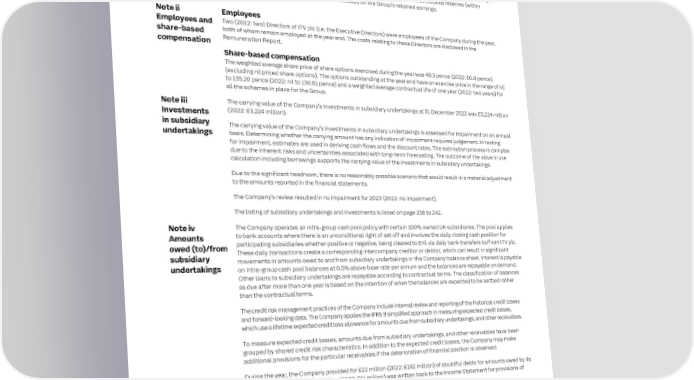 232 ITV plc Annual Report and Accounts 2023 ITV plc Annual Report and Accounts 2023 233 F I NOTES TO THE ITV PLC COMPANY FINANCIAL STATEMENTS CONTINUED NAN C I AL Derivatives and other financial instruments Exercises of share options granted to employees can be satisfied by market purchase or issue of new shares. No new S T nstruments to hedge its exposure to fluctuations in shares may be issued to satisfy exercises under the terms of the DSA. A The Company uses a limited number of derivative financial i T E interest and other foreign exchange rates. The Company does not hold or issue derivative instruments for During the year, all exercises were satisfied by using shares held in the ITV Employees’ Benefit Trust. The Trust is M speculative purposes. E accounted for as a separate entity and therefore is only accounted for in the consolidated ITV financial statements. N T Derivative financial instruments are initially recognised at fair value and are subsequently remeasured at fair value S with the movement recorded in the profit and loss account within net financing costs, except where derivatives Dividends to shareholders qualify for cash flow hedge accounting. In this case, the effective portion of cash flow hedge is recognised in other Dividends payable to shareholders are recognised through equity on the earlier of their approval by the Company’s reserves within equity. The cumulative gain or loss is later reclassified to the profit and loss account in the same shareholders or their payment. Dividends are distributed based on the realised distributable reserves (within period as the relevant hedged transaction is realised. Derivatives with positive fair values are recorded as assets retained earnings) of ITV plc (Company) and not based on the Group’s retained earnings. and negative fair values as liabilities. The fair value of foreign currency forward contracts is determined by using the difference between the contract Note ii Employees ctors) were employees of the Company during the year, exchange rate and the quoted forward exchange rate at the balance sheet date. Employees and Two (2022: two) Directors of ITV plc (i.e. the Executive Dire share-based both of whom remain employed at the year end. The costs relating to these Directors are disclosed in the The fair value of interest rate swaps is the estimated amount that the Company would receive or pay to terminate compensation Remuneration Report. the swap at the balance sheet date, taking into account current interest rates and the current creditworthiness of swap counterparties. Share-based compensation Third-party valuations are used to fair value the Company’s derivatives. The valuation techniques use inputs such as The weighted average share price of share options exercised during the year was 49.3 pence (2022: 50.6 pence) interest rate yield curves and currency prices/yields, volatilities of underlying instruments and correlations between (excluding nil priced share options). The options outstanding at the year end have an exercise price in the range of nil inputs. For financial assets and liabilities classified at fair value through profit or loss, the fair value change and to 135.20 pence (2022: nil to 130.61 pence) and a weighted average contractual life of one year (2022: two years) for interest income/expense are not separated. all the schemes in place for the Group. Current tax Note iii The carrying value of the Company’s investments in subsidiary undertakings at 31 December 2023 was £3,224 million Investments (2022: £3,224 million). Current tax is the expected tax payable or receivable on the taxable income or loss for the year and any adjustment in in subsidiary respect of previous years. The carrying value of the Company’s investments in subsidiary undertakings is assessed for impairment on an annual undertakings basis. Determining whether the carrying amount has any indication of impairment requires judgement. In testing The Company recognises liabilities for anticipated tax issues based on estimates of the additional taxes that are for impairment, estimates are used in deriving cash flows and the discount rates. The estimation process is complex likely to become due, which require judgement. Amounts are accrued based on management’s interpretation of due to the inherent risks and uncertainties associated with long-term forecasting. The outcome of the value in use specific tax law and the likelihood of settlement. Where the final tax outcome of these matters is different from the calculation including borrowings supports the carrying value of the investments in subsidiary undertakings. amounts that were initially recorded, such differences will impact the current tax and deferred tax provisions in the period in which such determination is made. Due to the significant headroom, there is no reasonably possible scenario that would result in a material adjustment to the amounts reported in the financial statements. Deferred tax The tax charge for the year is recognised in the Income Statement or directly in equity according to the accounting The Company’s review resulted in no impairment for 2023 (2022: no impairment). treatment of the related transaction. The listing of subsidiary undertakings and investments is listed on page 238 to 242. Deferred tax arises due to certain temporary differences between the carrying amount of assets and liabilities for financial reporting purposes and those for taxation purposes. The amount of deferred tax provided is based on the Note iv The Company operates an intra-group cash pool policy with certain 100% owned UK subsidiaries. The pool applies expected manner of realisation or settlement of the carrying amount of assets and liabilities. A deferred tax asset is Amounts to bank accounts where there is an unconditional right of set off and involves the daily closing cash position for recognised only to the extent that it is probable that sufficient taxable profit will 
