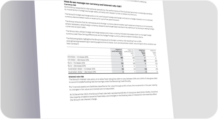 210 ITV plc Annual Report and Accounts 2023 ITV plc Annual Report and Accounts 2023 211 F I NOTES TO THE FINANCIAL STATEMENTS NAN SECTION 4: CAPITAL STRUCTURE AND FINANCING COSTS CONTINUED C I AL Determining fair value What is the value of our derivative financial instruments? S T The fair value of forward foreign exchange contracts is determined by the change in price between the contracted rates The following table shows the fair value of derivative financial instruments analysed by type of contract. Interest rate A T E and the market rates at the reporting date. The contracted cash flows are then discounted by the time remaining to the swap fair values exclude accrued interest. M settlement date of the contract, with a discount curve that incorporates credit risk. The fair value of interest rate swaps E N is the estimated amount that the Group would receive or pay to exit the swap at the reporting date, taking into account Assets Liabilities T current interest rates and the Group’s current creditworthiness, as well as that of the swap counterparties. At 31 December 2023 £m £m S Current Third-party valuations are used to fair value the Group’s cross currency interest rate derivatives. The valuation Foreign exchange forward contracts and swaps – cash flow hedges 3 (1) techniques use inputs, such as interest rate yield curves and currency prices/yields, volatilities of underlying Foreign exchange forward contracts and swaps – fair value through profit or loss 1 – instruments and correlations between inputs. Non-current How do we manage our currency and interest rate risk? Cross-currency interest swaps – cash flow hedges – (15) Currency risk Foreign exchange forward contracts and swaps – cash flow hedges 1 (1) As the Group expands its international operations, the performance of the business becomes increasingly sensitive 5 (17) to movements in foreign exchange rates, primarily with respect to the US dollar and the euro. The Group’s foreign exchange policy is to use forward foreign exchange contracts to hedge material non-functional Assets Liabilities currency denominated costs or revenue for up to five years forward. At 31 December 2022 £m £m Current The Group ensures that its net exposure to foreign currency denominated cash balances is kept to a minimal level, Foreign exchange forward contracts and swaps – cash flow hedges 2 (6) where necessary using foreign currency swaps to exchange balances back into sterling or by buying or selling foreign Foreign exchange forward contracts and swaps – fair value through profit or loss – (1) currencies at spot rates. Non-current The Group also utilises foreign exchange swaps and cross-currency interest rate swaps both to manage foreign Cross-currency interest swaps – cash flow hedges – (8) currency cash flow timing differences and to hedge foreign currency denominated monetary items. Foreign exchange forward contracts and swaps – cash flow hedges 2 – 4 (15) The following table highlights the Group’s exposure to foreign currency risk resulting from a 10% strengthening/weakening in sterling against the US dollar, euro and Australian dollar, assuming all other variables are Cash flow hedges held constant: The Group applies hedge accounting for certain foreign currency firm commitments and highly probable cash flows where the underlying cash flows are payable within the next five years. In order to fix the sterling cash outflows Impact on Impact on Impact on Impact on associated with the commitments and interest payments – which are mainly denominated in US dollars or euros – profit before tax profit before tax Equity Equity the Group has taken out forward foreign exchange contracts and cross-currency interest rate swaps for the same 2023 2022 2023 2022 £m £m £m £m foreign currency amount and maturity date as the expected foreign currency outflow. US dollar – increase 10% (6) (9) 7 6 US dollar – decrease 10% 7 9 (8) (8) There is an economic relationship between the hedged items (being between 60% to 100% of the total exposure) and Euro – increase 10% (1) (4) 1 (3) the hedging instruments as the terms of the foreign exchange forward contracts and cross-currency interest rate swaps Euro – decrease 10% 2 5 – 4 match the terms of the expected highly probable forecast transactions or firm commitments (i.e. % notional amount Australian dollar – increase 10% (1) (1) (2) (4) and expected receipt or payment date). The Group has established a hedge ratio of 1:1 for the hedging relationships as the underlying risk of the foreign exchange forward contracts are identical to the hedged risk components. Australian dollar – decrease 10% 1 1 2 4 Sources of ineffectiveness include: Interest rate risk • Different interest rate curve applied to discounting the hedged items and hedging instruments The Group’s interest rate policy is to allow fixed rate gross debt to vary between 20% and 100% of total gross debt • Differences in the timing of the cash flows of the hedged items and the hedging instruments to accommodate floating rate borrowings under the Revolving Credit Facility. • The counterparties’ credit risk differently impacting the fair value movements of the hedging instruments and For financial assets and liabilities classified at fair value through profit or loss, the movements in the year relating hedged items and to changes in fair value and interest are not separated. • Changes to the forecasted amount of cash flows of hedged items and hedging instruments At 31 December 2023, the Group’s fixed rate debt represented 69.9% of total gross debt (2022: 93.8%), therefore The Group uses the hedge relationship, credit risk and hedge ratio to measure the hedge effectiveness. the majority of debt is issued at fixed rates, and changes in the floating rates of interest do not materially affect The amount recognised in other comprehensive income during the year all relates to the effective portion of 