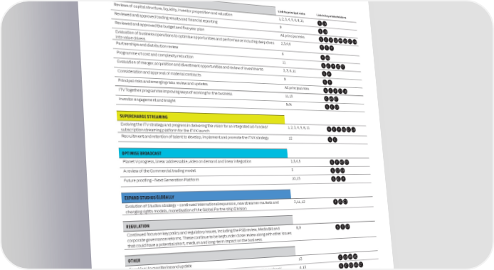 82 ITV plc Annual Report and Accounts 2023 ITV plc Annual Report and Accounts 2023 83 CORPORATE GOVERNANCE CONTINUED G O VE R NAN PLC Board and Committee membership and attendance C PLC Board and Committee membership and attendance at scheduled meetings in 2023 is set out below. KEY STRATEGIC MATTERS CONSIDERED BY THE BOARD IN 2023 E In addition, chaired by the Senior Independent Director, the Non-executive Directors met without the Chair or management during the year to Stakeholder groups discuss the Chair’s performance, and also met with the Chair without the management present, on an informal basis throughout the year to S Shareholders (including debt providers)C Colleagues P Partners discuss matters relevant to the Group. The Non-executive Directors met with the Chief Executive to discuss Management Board talent and succession. CZ Citizens PP Programme participants VC Viewers and subscribers * Indicates where a Director has attended all or part of a PLC Board CT Customers (including advertisers) LR Legislators and regulators Attendance at scheduled meetings or Committee meeting by invitation (i.e. when not a member or prior to being a Director). The Executive Directors did not attend Committee membersPLC Board1 Audit and Risk Remuneration NominationsDisclosureparts of any Committee meetings where to do so would result in PERFORMANCE Link to principal risks Link to key stakeholders Andrew Cosslett (Chair)8/85/5*5/54/44/4a conflict of interest. A number of ad hoc Board and Committee meetings were held Reviews of capital structure, liquidity, investor proposition and valuation 1, 2, 3, 4, 5, 6, 8, 11 S LR Dawn Allen22/81/5---during 2023 though these are not reflected in this table. Reviewed and approved trading results and financial reporting 9 S LR Salman Amin8/8-5/54/4-1. In June and December half-day strategy sessions were held with a scheduled Board meeting held on the same day. Together these Reviewed and approved the budget and five year plan All principal risks 3are included in the table as one meeting S C P CZ PP VC CT LR Edward Bonham Carter 8/85/53/54/4- Graham Cooke48/85/5-2/4-2. Dawn Allen joined the Board on 2 October 2023 Evaluation of business operations to optimise opportunities and performance including deep dives 2,3,4,6 S C P 3. Edward Bonham Carter joined the Remuneration Committee in into value drivers Margaret Ewing98/85/5-2/43/4April 2023 4. Graham Cooke, Margaret Ewing and Sharmila Nebhrajani joined Partnerships and distribution review 6 P VC 5 Mary Harris2/81/5-2/4-the Nominations Committee in April 2023 Marjorie Kaplan63/8----5. Mary Harris stepped down from the Board on 3 May 2023Programme of cost and complexity reduction 11 S C P VC CT Gidon Katz8/8----6. Marjorie Kaplan joined the Board on 1 September 2023Evaluation of merger, acquisition and divestment opportunities and review of investments 2, 3, 6, 11 S P 7. Anna Manz stepped down from the Board on 31 August 2023 Chris Kennedy 8/85/53/5*1/4*4/48. Duncan Painter stepped down from the Board on 30 November Consideration and approval of material contracts 9 S P 72023 Anna Manz5/83/53/5-- 9. Margaret Ewing was unable to attend a Disclosure Committee Principal risks and emerging risks review and updates All principal risks S C P CT LR Carolyn McCall 8/82/5*1/4*4/4because of another commitment 4 ITV Together programme improving ways of working for the business 11,13 C VC CT Sharmila Nebhrajani8/8-5/52/4- Duncan Painter87/8-4/5-- Investor engagement and insight N/A S C LR SUPERCHARGE STREAMING BOARD COMPOSITION Evolving the ITV strategy and progress in delivering the vision for an integrated ad-funded/ 1, 2, 3, 4, 5, 6, 11 S C P VC CT LR subscription streaming platform for the ITVX launch Recruitment and retention of talent to develop, implement and promote the ITVX strategy 12 S C GENDERETHNICITYDISABILITYBOARD TENUREAGE OPTIMISE BROADCAST Planet V progress, linear addressable, video on demand and linear integration 2,3,4,5 S P VC CT A review of the Commercial trading model 3 S CT LR Future proofing – Next Generation Platform 10, 15 S C P EXPAND STUDIOS GLOBALLY Men 6 People of Colour 2 Disability or long-term 0–2 years 4 36–45 1 Women 5 White 9health condition 1 2–5 years 2 46–55 2Evolution of Studios strategy – continued international expansion, new streamer markets and 2, 11, 12 P VC CT No disability or long-term 5–9 years 5 56–65 5changing rights models, monetisation of the Global Partnership Division health condition 10 66–75 3 REGULATION Continued focus on key policy and regulatory issues, including the PSB review, Media Bill and 8,9 S C LR * BOARD SKILLS AND EXPERIENCEMANAGEMENT BOARD COMPOSITIONcorporate governance reforms. These continue to be kept under close review along with other issues that could have a potential short, medium and long-term impact on the business Business transformation10GENDERETHNICITYDISABILITY Creative industry4 OTHER Speaking Up monitoring and update 13 C CZ PP VC Digital7 Finance and Treasury Social Purpose strategy including environmental targets and mental health and ‘giving back’ 4, 13 S C CZ VC CT 5 campaigns Audit5 Crisis management processes and protocols 15 S C CZ VC CT Sustainability and ESG5 Legal and compliance updates, including CMA investigations and Phillip Schofield KC review 8,9 S C CT Media and Media IP8 Review and annual approval of relevant Group compliance, HR and governance policies 8,9,13 S LR Regulation and Public Policy3 Men 8 People of Colour 1 Disability or long-term Climate-related risks and short to medium-term impacts, reporting on ESG matters 4, 8, 11 Women 2 White 9health condition 2 S C CZ VC CT Strategy11 No disability or long-term Diversity and Inclusion, how this aligns and supports the ITV Strategy 9, 11, 13 S C CZ VC health condition 8 (continue to drive mainstream disability accessibility and building an inclusive culture) Technology and Data4 Cyber Security – fraud prevention strategy 10 S C P CZ PP VC CT LR Remun