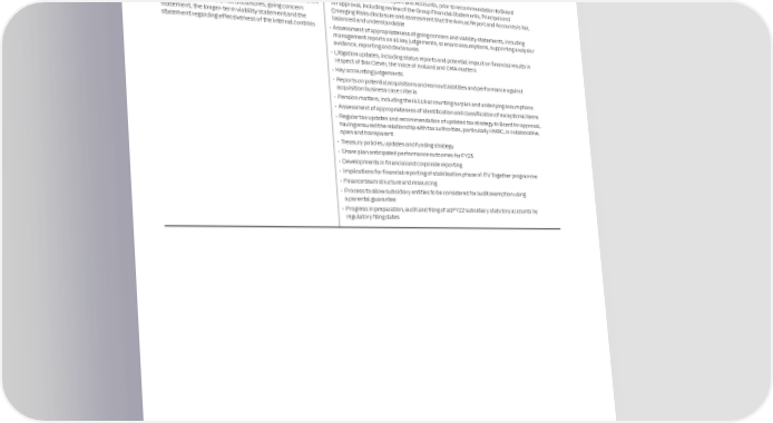 108 ITV plc Annual Report and Accounts 2023 ITV plc Annual Report and Accounts 2023 109 AUDIT AND RISK COMMITTEE REPORT CONTINUED G O VE R NAN C FINANCIAL REPORTING SIGNIFICANT AUDIT RISKS AND ACCOUNTING JUDGEMENTS E Our role Reviewed In planning its agenda and reviewing the audit plans of the internal and external auditors, the Committee has considered significant operational and financial issues and risks which may have had an impact on the Company’s financial statements, internal controls and/or the delivery and execution of the Company’s • Monitor the integrity of published financial information and • Quarterly, interim and full year results statements, prior to recommendation to Board for strategy (including changes in the nature and significance of some of the Group’s Principal Risks). review and challenge significant financial reporting issues, approval, together with supporting reports from the Group Director of Finance highlighting estimates and judgements all key judgements and estimates The Committee focused on assessing whether management had made appropriate judgements and estimates in preparing the Company’s financial • Review the appropriateness of accounting policies • External auditor reports, including progress updates, regarding interim review and full statements, particularly with regard to the significant issues listed below. These issues were subject to robust challenge and debate between management, and practices year audit the external auditor and the Committee. The Committee also reviewed detailed external auditor reports outlining work performed and any issues identified in respect of key judgements and estimates – see the Independent Auditor’s Report on pages 149 to 155. The Committee concluded there was no significant • Provide advice to the Board on whether the Annual Report • Final draft 2023 Annual Report and Accounts, prior to recommendation to Board disagreement or unresolved issue that required referral to the Board. and Accounts are fair, balanced and understandable and the for approval, including review of the Group Financial Statements, Principal and appropriateness of the risk disclosures, going concern Emerging Risks disclosure and assessment that the Annual Report and Accounts is fair, Risk of fraud (particularly in revenue recognition) statement, the longer-term viability statement and the balanced and understandable statement regarding effectiveness of the internal controls • Assessment of appropriateness of going concern and viability statements, including Issue Action taken by the Committee Outcome/future actions management reports on all key judgements, scenario assumptions, supporting analysis/ The nature of ITV’s business, Review of the work undertaken to update the GFO Finance In anticipation of the UK’s new corporate offence of evidence, reporting and disclosures including advertising and Fraud Prevention Framework following the implementation ‘failure to prevent fraud’, the Committee discussed ITV’s plan • Litigation updates, including status reports and potential impact on financial results in production, means that there of the Oracle Fusion platform and the subsequent impact to respond to the new legislation during 2024 including: respect of Box Clever, the Voice of Holland and CMA matters are potential risks of revenue on the controls in place to prevent and detect fraud across • Updating the Fraud Risk Management policy and the fraud • Key accounting judgements recognition and other fraud, all aspects of the Group, including the international risk assessment including collusion with studios businesses. • Reports on potential acquisitions and earnout liabilities and performance against advertisers, facilitation • Monitoring of high-risk financial controls acquisition business case criteria payments, fraudulent The Committee also considered the Group’s changing risk • Delivery of targeted training • Pension matters, including the IAS 19 accounting surplus and underlying assumptions payments to suppliers or landscape and the implications for non-financial fraud risk. • Reviewing ITV’s due diligence processes and • Assessment of appropriateness of identification and classification of exceptional items employees and manipulation In addition, the Committee reviewed the results of PwC’s contractual provisions • Regular tax updates and recommendation of updated tax strategy to Board for approval, of profits or hiding fraud by data auditing techniques for advertising revenue, journals use of accounting journals. and payroll as well as their conclusions relating to fraud risk The Committee agreed with management’s assessment that having ensured the relationship with tax authorities, particularly HMRC, is collaborative, the overall control framework remained effective and the open and transparent in revenue recognition. Group’s revenue recognition processes included a robust • Treasury policies, updates and funding strategy control framework to effectively mitigate the risk of material • Share plan anticipated performance outcomes for FY23 financial fraud. • Developments in financial and corporate reporting • Implications for financial reporting of stabilisation phase of ITV Together programme Exceptional items including Alternative Performance Measures • Finance team structure and resourcing Issue Action taken by the Committee Outcome/future actions • Process to allow subsidiary entities to be considered for audit exemption using a parental guarantee During 2023, management The Committee continued to closely scrutinise the The Committee concluded that the policy in respect of proposed a number of application of the Group’s policy on exceptional items, exceptional items and management’s approach to • Progress in preparation, audit and filing of all FY22 subsidiary statutory accounts by matters to be classified as spending considerable time reviewing the existing