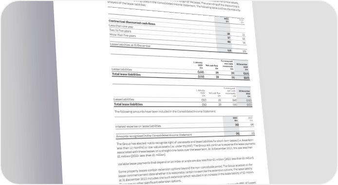 220 ITV plc Annual Report and Accounts 2023 ITV plc Annual Report and Accounts 2023 221 F I NOTES TO THE FINANCIAL STATEMENTS NAN SECTION 4: CAPITAL STRUCTURE AND FINANCING COSTS CONTINUED C I AL Fair value Level 1 Level 2 Level 3 4.6 Keeping The Group accounts for operating leases under IFRS 16 ‘Leases’. Lease liabilities S 31 December 31 December 31 December 31 December T it simple representing the discounted future lease payments and right of use assets A 2022 2022 2022 2022 Lease T £m £m £m £m are recognised in the Consolidated Statement of Financial Position. Lease costs E liabilities M such as property rent are now recognised in the form of depreciation and interest in E Assets measured at fair value N the Consolidated Income Statement. T Financial instruments at fair value through reserves S Other pension assets – gilts (see note 3.7) 47 47 – – Financial instruments at fair value through profit or loss Accounting policies Money market funds 91 91 – – Lease liabilities represent the discounted future lease payments. Discount rates are calculated for similar assets, Equity investments (see note 3.5) 11 – – 11 in similar economic environments, taking into account the length of the lease. The unwinding of the discounting is Financial assets at fair value through profit or loss recognised in net financing costs in the Consolidated Income Statement. The following table outlines the maturity analysis of the lease liabilities: Convertible loan receivable 3 – – 3 Financial assets at fair value through reserves 2023 2022 Cash flow hedges 4 – 4 – £m £m 156 138 4 14 Contractual discounted cash flows Less than one year 18 21 Fair value Level 1 Level 2 Level 3 Two to five years 57 55 31 December 31 December 31 December 31 December More than five years 40 56 2022 2022 2022 2022 £m £m £m £m Liabilities measured at fair value Lease liabilities at 31 December 115 132 Financial liabilities at fair value through profit or loss Foreign exchange forward contracts and swaps (1) – (1) – Acquisition-related liabilities – payable to sellers under Currency and put options agreed on acquisition (see notes 3.1.4 1 January non-cash 31 December 2023 Net cash flow movements 2023 and 3.1.5) (39) – – (39) £m £m £m £m Financial liabilities at fair value through reserves Lease liabilities (132) 26 (9) (115) Cash flow hedges (14) – (14) – Total lease liabilities (132) 26 (9) (115) (54) – (15) (39) Refer to note 4.3 for how we value interest rate swaps and forward foreign currency contracts. Currency and 1 January non-cash 31 December 2022 Net cash flow movements 2022 £m £m £m £m Lease liabilities (92) 26 (66) (132) Total lease liabilities (92) 26 (66) (132) The following amounts have been included in the Consolidated Income Statement: 2023 2022 £m £m Interest expense on lease liabilities (4) (4) Amounts recognised in the Consolidated Income Statement (4) (4) The Group has elected not to recognise right of use assets and lease liabilities for short-term leases (i.e. lease term less than 12 months) or low-value assets (i.e. under £5,000). The Group will continue to expense the lease payments associated with these leases on a straight-line basis over the lease term. At 31 December 2023, this was less than £1 million (2022: less than £1 million). Variable lease payments that depend on an index or a rate are also less than £1 million (2022: less than £1 million). Some property leases contain extension options beyond the non-cancellable period. The Group assesses at the lease commencement date whether it is reasonably certain to exercise the extension options. The lease liability at 31 December 2023 includes one such extension which resulted in an increase in the lease liability of £2 million. There are no other significant extension options. The Group signed a subleasing arrangement, which is classified as a finance lease in accordance with IFRS 16 ‘Leases’. In accordance with the standard, the right of use asset with a net book value of £8 million was derecognised and replaced by a net investment in the sublease which has been recognised within other receivables. See note 3.2. This arrangement does not impact the lease liabilities arising from the original lease which have been included in this note.