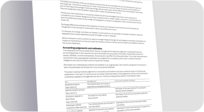 164 ITV plc Annual Report and Accounts 2023 ITV plc Annual Report and Accounts 2023 165 F I NOTES TO THE FINANCIAL STATEMENTS NAN SECTION 1: BASIS OF PREPARATION CONTINUED C I AL Foreign currencies The Directors recognise the climate crisis and the potential impact it may have on both the wider world and the S T The primary economic environment in which the Group operates is the UK and therefore the consolidated financial success of ITV. The threat continues to evolve and businesses globally have a responsibility to take meaningful A T action to mitigate and prevent further climate change. The Directors are committed to reducing the impact of ITV E statements are presented in pounds sterling (‘£’). M on the environment. Climate-related risks have been identified as an emerging business risk; however, the Directors E N Where Group companies based in the UK transact in foreign currencies, these transactions are translated into do not view them as a source of material estimation uncertainty for the Group. For further detail, see the Risks and T pounds sterling at the exchange rate on the transaction date. Foreign currency monetary assets and liabilities are Uncertainties section of the Strategic Report. S translated into pounds sterling at the year end exchange rate. Where there is a movement in the exchange rate between the date of the transaction and the year end, a foreign exchange gain or loss is recognised in the income New or amended accounting standards statement. Non-monetary assets and liabilities measured at historical cost are translated into pounds sterling at the The following new standards and/or amendments were effective 1 January 2023, but have not had a significant exchange rate on the date of the transaction. impact on the Group’s results or Consolidated Statement of Financial Position. The assets and liabilities of Group companies outside of the UK are translated into pounds sterling at the year end Accounting standard Requirement Impact on financial statements exchange rate. The revenue, expenses and other comprehensive income of these companies are translated into IFRS 17 ‘Insurance IFRS 17 ‘Insurance Contracts’ is a comprehensive new No material change to the pounds sterling at the average monthly exchange rate during the year. Where differences arise between these rates, Contracts’ and related accounting standard covering recognition, measurement, Group’s financial position they are recognised in the translation reserve within other comprehensive income. amendments presentation and disclosures. This standard replaces IFRS or performance. 4 ‘Insurance Contracts’. The Group’s net investments in companies outside the UK may be hedged where the currency exposure is considered to be material. Hedge accounting is implemented on certain foreign currency firm commitments, for Amendments to IAS 1 The amendments aim to help entities provide accounting No material change to the which the effective portion of any foreign exchange gains or losses is recognised in other comprehensive income ‘Presentation of Financial policy disclosures that are more useful by replacing the Group’s financial position (note 4.3). Statements’ and IFRS requirement for entities to disclose their ‘significant’ or performance. Practice Statement 2 accounting policies with a requirement to disclose their Exchange differences arising on the translation of the Group’s interests in joint ventures and associates are ‘Making Materiality ‘material’ accounting policies. The IFRS Practice Statement 2 recognised in the translation reserve within other comprehensive income. Judgements’ has been amended by adding guidance and examples to On disposal of a foreign subsidiary, an interest in a joint venture or an associate, the related translation reserve is explain and demonstrate the application of the ‘four-step released to the income statement as part of the gain or loss on disposal. materiality process’ in making decisions about accounting policy disclosures. Where a forward currency contract is used to manage foreign exchange risk and hedge accounting is not applied, any Amendments to IAS 8 The amendments introduce a new definition of accounting No material change to the impact of movements in currency for both the forward currency contracts and the assets and liabilities is taken to ‘Accounting Policies, estimates and clarify how entities use measurement Group’s financial position the income statement. Changes in Accounting techniques and inputs to develop accounting estimates. or performance. Accounting judgements and estimates Estimates and Errors’ The preparation of financial statements requires management to exercise judgement in applying the Group’s Amendments to IAS 12 The amendments aim to narrow the scope of the initial No material change to the accounting policies. It also requires the use of estimates and assumptions that affect the reported amounts of ‘Income taxes’ – Initial recognition exception under IAS 12 so that it no longer Group’s financial position assets, liabilities, income and expenses. Actual results may differ from these estimates. The current macroeconomic recognition exception applies to transactions that give rise to equal taxable and or performance. environment has caused greater estimation and judgement to be applied, particularly in respect of pension deductible temporary differences. obligations and discount rates used for impairment reviews. Amendments to IAS 12 The amendments provide a temporary exception from The Group has applied the Estimates and underlying assumptions are reviewed on an ongoing basis, with revisions recognised in the period in ‘Income Taxes’- Pillar Two the requirement to recognise and disclose deferred taxes exception under IAS 12 to which the estimates are revised and in any future periods affected. income taxes arising from enacted or substantively enacted tax law recognising and disclosing