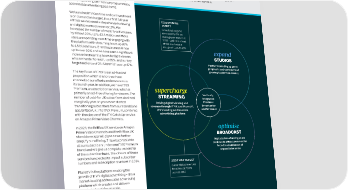 10 ITV plc Annual Report and Accounts 2023 ITV plc Annual Report and Accounts 2023 11 S CHIEF EXECUTIVE’S STATEMENT CONTINUED T R A T E G I Media & Entertainment (M&E) C R E P ITV M&E is the largest commercial OUR MORE THAN TV STRATEGY O R broadcaster and streamer in the UK, Our strategy is focused on three strategic pillars 1) Expand Studios; 2) Supercharge To support the successful delivery of the strategy, we have key The successful execution of our strategy to date has made ITV more T delivering unrivalled audience scale and Streaming; and 3) Optimise Broadcast. These pillars are underpinned by a number of performance indicators (KPIs) and related targets to be delivered robust. ITV has a leading, scaled, global Studios business, a high reach. It is underpinned by two strategic priorities (detailed below) to ensure that ITV is best placed to capitalise on the from 2021 to 2026 which we are on track to deliver. The key to growth Streaming service and a cash generative linear advertising pillars; Supercharge Streaming and opportunities presented by the rapidly changing viewing, content production and successfully delivering this strategy is digitally transforming business. This ensures that we are well placed to grow profits from Optimise Broadcast. advertising environments. These pillars are not independent. They work together – everything we do. here as we continue to drive material efficiencies, invest behind our reinforcing each other, creating synergies and delivering value. strategic priorities and deliver returns to shareholders. By Supercharging Streaming, we aim to drive digital revenues through ITVX and Planet V (ITV’s proprietary, self-service programmatic addressable advertising platform). We launched ITVX on time and our investment is on plan and on budget. In our first full year 2026 STUDIOS ITV Studios – STRATEGIC PRIORITIES AND KPI TARGETS of ITVX we delivered a step change in viewing TARGET Expanding UK and global productions is central to ITV’s strategy. ITV Studios’ ambition is to be a leading and digital revenues were up 19%. We Grow total organic force in the creation and ownership of intellectual property (IP), global content production and distribution. increased the number of monthly active users revenues by 5% on We are achieving this by focusing on our four strategic priorities to drive revenue and profit growth. by almost 20%, up to 12.5 million and those average per annum to 2026 – which is ahead users are spending more time engaging with of the market at a the platform with streaming hours up 26% PRIORITIES WHY IT’S IMPORTANT FY 2026 TARGET FY 2023 WHAT IT DRIVES margin of 13% to 15% to 1.5 billion hours. Brand awareness is now expand STU 1. Grow our To meet the growing 400 high-end scripted 316 hours Growth in total up to over 90% and we have seen a significant global demand for hours per annum scripted business organic revenue of 5% increase in streaming hours for light viewers STUDIOS D (2022: 276 hours) I scripted content who are harder to reach, up 65%, and our key O on average per annum Further expanding by genre, S particularly from 1 target audience of 25-54s which was up 47%. streaming platforms to 2026 which is geography and customer and ahead of the market growing faster than market To maximise international 20 formats sold in three or 19 formats The key focus of ITVX is our ad-funded 2. Grow our Delivers adjusted global formats monetisation of more countries (2022: 19 formats) proposition which is where we have EBITA2 business high-value formats margins of 13% channelled our efforts and resources in to 15% its launch year. In addition, we have ITVX 3. Further diversify To capture the growth in 30% of total revenues 32% Premium, a subscription service, which is supercharge our customer base content spend from local from streaming platforms primarily an ad-free offering for viewers. The (2022: 22%) In 2023, total organic Vertically and global streaming number of paid-for UK subscribers declined STREAMING Integrated platforms revenue grew 3% at marginally year on year as we started Driving digital viewing and Producer an adjusted EBITA transitioning subscribers from our standalone revenue through ITVX and Planet V, Broadcaster 4. Attract and retain Key to creative success N/A N/A margin of 13.2% ITV’s leading addressable and Streamer leading talent of a Studios business app, BritBox UK, into ITVX Premium, combined with the closure of the ITV Catch Up service advertising platform on Amazon Prime Video Channels. In 2024, the BritBox UK service on Amazon optimise MEDIA & ENTERTAINMENT – STRATEGIC PRIORITIES AND KPI TARGETS Prime Video Channels and the Britbox UK ITV’s M&E strategy is based on two core pillars: Supercharge Streaming and Optimise Broadcast, with standalone app will close as we further BROADCAST strategic priorities to drive growth in digital revenues and maintain strength in linear. simplify our offering. This will consolidate Digitally transforming as we all our subscribers under one ITVX Premium continue to attract commercial PRIORITIES WHY IT’S IMPORTANT FY 2026 TARGET FY 2023 WHAT IT DRIVES brand and will give us complete ownership broadcast audiences of unparalleled scale S of the subscriber base. The closure of these TR 1. Attract more monthly ITV’s reach is key to Grow monthly active 12.5 million Growth in digital retaining and attracting users to 20 million services is expected to impact subscriber E active users to ITVX (2022: 10.5 million) revenues to at least numbers and subscription revenues in 2024. A advertisers £750m by 2026 2026 M&E TARGET MI Grow digital revenues N 2. Increase the ITV’s scale is key to Grow total streaming 1,505 million hours Revenues from linear Planet V is the platform enabling the to at least £750m G time users spend retaining and attracting hours to 2 billion hours (2022: 1,192 million TV advertising, growth of ITV’s digital advertising – it is a across M&E on ITVX 