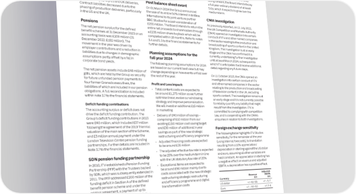50 ITV plc Annual Report and Accounts 2023 ITV plc Annual Report and Accounts 2023 51 S FINANCE REVIEW CONTINUED T R A T E G I Funding and liquidityReported net debt Production inventories, contract therefore the £16 million payment may • Total pension deficit funding contributions C R resume in 2024. The Group retains day-to- for 2024 are expected to come down year E Debt structure and liquidity2023 2022 assets and liabilities P At 31 December£m£m day operational control of SDN and SDN’s on year. More detailed guidance will be O In 2023, contract assets increased by R The Group’s financing policy is to manage its Gross cash 340348£17 million, production inventories revenues, profits and cashflows continue to given following the completion on the T liquidity and funding risk for the medium to be consolidated in the Group’s accounts. On triennial valuation long term. ITV uses debt instruments with a Gross debt (including IFRS 16 lease liabilities)(893)(971)decreased by £259 million and contract completion of the final payment in 2031, the range of maturities, has access to liabilities decreased by £185 million • The Board has proposed a final dividend Net debt (553)(623) Scheme’s partnership interest will have been of 3.3p, which will be paid in May 2024. appropriate short‑term borrowing facilities compared to 31 December 2022. Contract repaid in full and it will have no right to any and has a policy to maintain a minimum of assets increased due to UK scripted growth This gives a full year dividend of 5.0p. further payments. Going forward, the Board intends to pay £250 million of cash and undrawn committed with streaming platforms. The production facilities available at all times. We have three inventories decrease was driven a full year ordinary dividend of at least committed facilities in place to maintain our Financing – gross debtpredominantly by key US and UK deliveries. Post balance sheet event 5.0p, which it expects to grow over the W medium term financial flexibility, which includes a £500 e are financed using debt instruments and facilities with a range of maturities. Borrowings at Contract liabilities decreased due to the On 01 March 2024 the Group announced million multilateral Revolving Credit Facility 31 December 2023 were repayable as follows:phasing of production deliveries, particularly the sale of its entire 50% interest in BritBox (RCF). £83 million of this facility matures in in the US and the UK. International to its joint venture partner CMA Investigation January 2028, and £417 million remains BBC Studios for a cash consideration of As previously reported, on 12 July 2022, committed until January 2029. The RCF has Amount repayable as at 31 December 2023£mMaturityPensions £255 million. The Board intends to return the the UK Competition and Markets Authority leverage and interest cover covenants which €600 million Eurobond*535Sep 2026 entire net proceeds to shareholders through (CMA) opened an investigation into certain require us to maintain a covenant net debt to The net pension surplus for the defined a £235 million share buyback which will be £230 million term loan230Jul 2027benefit schemes at 31 December 2023 on an conduct of ITV and other named companies adjusted EBITDA ratio of below 3.5x and completed within 18 months. Refer to notes in the sector relating to the production and Other loans13Various accounting basis was £209 million (31 3.4 and 5.3 to the financial statements for interest cover (adjusted EBITDA to net broadcasting of sports content in the United finance charges) above 3.0x. Total debt repayable on maturity**778December 2022: £192 million). The further details. movement in the year was driven by Kingdom. The investigation is at an early * Includes £15 million currency component of swaps held against euro‑denominated bond.employer contributions and a reduction in stage and the CMA has confirmed it is At 31 December 2023, ITV’s financial position ** Excludes £115 million of IFRS16 Lease Liabilities.liabilities due to changes in demographic Planning assumptions for the currently undertaking further investigation was well within its covenants. During the assumptions partly offset by a fall in full year 2024 until at least March 2024, subsequent to year, the Group secured an additional £100 The Group’s €259 million Eurobond which matured in December 2023 was refinanced by corporate bond yields.The following planning assumptions for 2024 which ITV anticipates it will receive additional million of committed funding via a bilateral drawing on the £230 million committed four year term loan, maturing in July 2027. The term are based on our current best view but may detail regarding any future steps. RCF which matures in 2028. The terms and loan has the same financial covenants as ITV’s Revolving Credit Facility and is excluded from The net pension assets include £48 million of change depending on how events unfold over conditions, including financial covenants, the total committed undrawn facilities of £900 million.gilts, which are held by the Group as security the rest of the year. On 11 October 2023, the CMA opened an are aligned to the £500 million multilateral for future unfunded pension payments to investigation into certain conduct of ITV RCF facility. four former Granada executives, the Profit and Loss impact: and other named companies in the sector liabilities of which are included in our pension relating to the production and broadcasting We also have a bilateral financing facility Capital allocation and leverageForeign exchange • Total content costs are expected to of television content in the UK, excluding of £300 million, which is free of financial obligations. A full reconciliation is included be around £1,275 million as we further In line with our capital allocation policy, our As ITV continues to grow internationally, we within note 3.7 to the financial statements. sports content. The inv