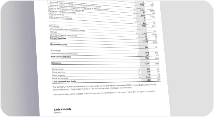 228 ITV plc Annual Report and Accounts 2023 ITV plc Annual Report and Accounts 2023 229 F I NOTES TO THE FINANCIAL STATEMENTS ITV PLC COMPANY FINANCIAL STATEMENTS NAN SECTION 5: OTHER NOTES CONTINUED C I AL Company number Company name Company number Company name Statement of Financial Position S T 01565625 ITV Properties (Developments) Limited 12116627 WP Karen Pirie Limited A 13087782 ITV Ralph and Katie Limited 14988579 WP Lockerbie Limited 2023 2022 T E 14460328 ITV RE Limited 11109287 WP LOD5 Limited As at 31 December Note £m £m M E 08554937 ITV Shetland Limited 12116457 WP LOD6 Limited Non-current assets N 11723826 ITV Spy Limited 13087865 WP Malpractice Limited T 02203983 ITV Studios Global Distribution Limited 12116461 WP Pembrokeshire Limited Investments in subsidiary undertakings iii 3,224 3,224 S 09498877 ITV TFG Holdings Limited 13087860 WP RM Limited Derivative financial instruments vi 2 2 11107934 ITV The Bay Limited 11109929 WP Save Me 2 Limited Other receivables 4 – 13087693 ITV The Reckoning Limited 12368475 WP Showtrial Limited Deferred tax asset 2 3 12368504 ITV TLC Limited 14653603 WP The Gathering Limited 09498177 ITV Top Class Limited 12368477 WP The Suspect Limited 3,232 3,229 14048049 ITV Venturer Limited 11109437 WP Vigil Limited Current assets ITV Properties (Jersey) Limited is exempt from audit under article 113 of the Companies Act (Jersey) Law 1991. Amounts owed by subsidiary undertakings due within one year iv 3,569 2,954 Amounts owed by subsidiary undertakings due after more than one year iv 97 96 Amounts owed by subsidiary undertakings iv 3,666 3,050 Derivative financial instruments vi 5 7 Other receivables 28 17 Cash and cash equivalents v 226 197 3,925 3,271 Borrowings – (279) Amounts owed to subsidiary undertakings iv (3,563) (2,681) Accruals (9) (8) Derivative financial instruments vi (5) (8) Current liabilities (3,577) (2,976) Net current assets 348 295 Borrowings v (750) (531) Derivative financial instruments vi (16) (10) Non-current liabilities (766) (541) Net assets 2,814 2,983 Share capital vii 406 403 Share premium viii 174 174 Other reserves viii 34 29 Retained earnings viii 2,200 2,377 Total shareholders’ funds 2,814 2,983 The Company has elected to take the exemption under section 408 of the Companies Act 2006 from presenting the parent company Income Statement. The Company’s profit for the year was £7 million (2022: profit of £800 million). The financial statements on pages 229 to 242 were approved by the Board of Directors on 7 March 2024 and signed on its behalf by Chris Kennedy Director