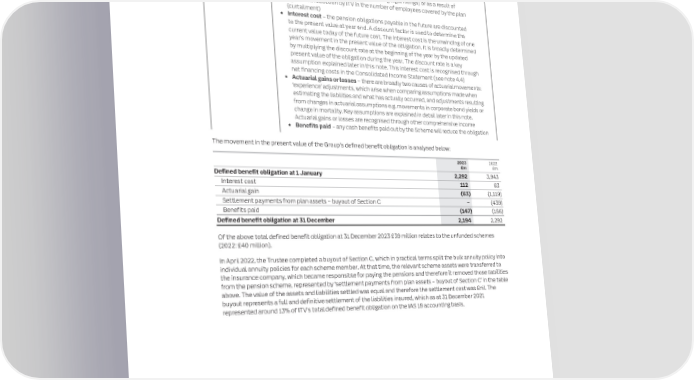 198 ITV plc Annual Report and Accounts 2023 ITV plc Annual Report and Accounts 2023 199 F I NOTES TO THE FINANCIAL STATEMENTS NAN SECTION 3: OPERATING ASSETS AND LIABILITIES CONTINUED C I AL Defined benefit scheme obligations Assumptions used to estimate the Scheme obligations S T A Keeping What causes movements in the defined benefit pension obligations? Keeping What are the main assumptions used to estimate the Scheme obligations? T E it simple The areas that impact the defined benefit obligation (the pension scheme it simple The main assumptions are: M E liabilities) position at the year end are as follows: N • An estimate of increases in pension payments and the effect of inflation T • Past service cost – is a change in present value of the benefits built up by the • The life expectancy of beneficiaries S beneficiaries in the prior periods; can be positive or negative resulting from • The discount rate used to estimate the present day fair value of these obligations changes to the existing plan as a result of an agreement between ITV and How do we determine the appropriate assumptions? employees or legislative change (including legal rulings) or as a result of The Group takes independent actuarial advice relating to the appropriateness of significant reduction by ITV in the number of employees covered by the plan the assumptions used. (curtailment) • Interest cost – the pension obligations payable in the future are discounted IFRS requires that we estimate a discount rate by reference to high-quality to the present value at year end. A discount factor is used to determine the fixed income investments in the UK that match the estimated term of the current value today of the future cost. The interest cost is the unwinding of one pension obligations. year’s movement in the present value of the obligation. It is broadly determined by multiplying the discount rate at the beginning of the year by the updated The inflation assumption has been set by looking at the difference between the present value of the obligation during the year. The discount rate is a key yields on fixed and index-linked government bonds. The inflation assumption is assumption explained later in this note. This interest cost is recognised through used as a basis for the remaining financial assumptions, except where caps have net financing costs in the Consolidated Income Statement (see note 4.4) been implemented. • Actuarial gains or losses – there are broadly two causes of actuarial movements: The discount rate has therefore been obtained using the yields available on AA rated ‘experience’ adjustments, which arise when comparing assumptions made when corporate bonds, which match projected cash flows. The Group’s estimate of the estimating the liabilities and what has actually occurred, and adjustments resulting weighted average term of the liabilities is 12 years (2021: 15 years). from changes in actuarial assumptions e.g. movements in corporate bond yields or change in mortality. Key assumptions are explained in detail later in this note. Actuarial gains or losses are recognised through other comprehensive income The principal assumptions used in the Schemes’ valuations at the year end were: • Benefits paid – any cash benefits paid out by the Scheme will reduce the obligation 2023 2022 Discount rate 4.75% 5.05% The movement in the present value of the Group’s defined benefit obligation is analysed below: Inflation assumption (RPI) 3.05% 3.15% 2023 2022 Deferred/ Deferred/ £m £m Pensioner Pensioner Defined benefit obligation at 1 January 2,292 3,943 Rate of increase in pension payment (LPI* 5% pension increases) 2.80%/3.00% 2.80%/3.00% Interest cost 112 63 Rate of increase to deferred pensions (CPI) 2.50% 2.50% Actuarial gain (63) (1,119) * Limited Price Index. Settlement payments from plan assets – buyout of Section C – (439) Benefits paid (147) (156) From February 2030 onwards, increases in the RPI will be aligned with those under the Consumer Prices Index (CPI). Defined benefit obligation at 31 December 2,194 2,292 For Defined Benefit schemes, it means that members with RPI-linked pension increases will see future retirement benefits increase more slowly from 2030 than they otherwise would. The Group’s approach to setting RPI and CPI Of the above total defined benefit obligation at 31 December 2023 £39 million relates to the unfunded schemes inflation assumptions is as follows: (2022: £40 million). • The Group continued to set RPI inflation in line with the market break-even expectations for inflation less an inflation risk premium of 0.3% In April 2022, the Trustee completed a buyout of Section C, which in practical terms split the bulk annuity policy into • The assumptions linked to RPI and CPI as at 31 December 2023 have been determined by weighting the cash individual annuity policies for each scheme member. At that time, the relevant scheme assets were transferred to flows to which the link applies the insurance company, which became responsible for paying the pensions and therefore it removed those liabilities The table below reflects published mortality investigation data in conjunction with the results of investigations into from the pension scheme, represented by ‘settlement payments from plan assets – buyout of Section C’ in the table the mortality experience of Scheme beneficiaries. The assumed life expectations on retirement for Section A are: above. The value of the assets and liabilities settled was equal and therefore the settlement cost was £nil. The buyout represents a full and definitive settlement of the liabilities insured, which as at 31 December 2021 2023 2023 2022 2022 represented around 13% of ITV's total defined benefit obligation on the IAS 19 accounting basis. Retiring today at age 60 65 60 65 Males 25.7 21.1 26.2 21.6 Females 27.3 22.6 28.9 24.1 Retiring in 20 years at age 60 65 60 65 Males 27.1 22.3 27.5 22.7 Females 28.9 24.0 30.4