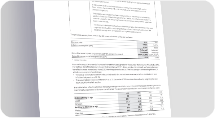 198 ITV plc Annual Report and Accounts 2023 ITV plc Annual Report and Accounts 2023 199 F I NOTES TO THE FINANCIAL STATEMENTS NAN SECTION 3: OPERATING ASSETS AND LIABILITIES CONTINUED C I AL Defined benefit scheme obligations Assumptions used to estimate the Scheme obligations S T A Keeping What causes movements in the defined benefit pension obligations? Keeping What are the main assumptions used to estimate the Scheme obligations? T E it simple The areas that impact the defined benefit obligation (the pension scheme it simple The main assumptions are: M E liabilities) position at the year end are as follows: N • An estimate of increases in pension payments and the effect of inflation T • Past service cost – is a change in present value of the benefits built up by the • The life expectancy of beneficiaries S beneficiaries in the prior periods; can be positive or negative resulting from • The discount rate used to estimate the present day fair value of these obligations changes to the existing plan as a result of an agreement between ITV and How do we determine the appropriate assumptions? employees or legislative change (including legal rulings) or as a result of The Group takes independent actuarial advice relating to the appropriateness of significant reduction by ITV in the number of employees covered by the plan the assumptions used. (curtailment) • Interest cost – the pension obligations payable in the future are discounted IFRS requires that we estimate a discount rate by reference to high-quality to the present value at year end. A discount factor is used to determine the fixed income investments in the UK that match the estimated term of the current value today of the future cost. The interest cost is the unwinding of one pension obligations. year’s movement in the present value of the obligation. It is broadly determined by multiplying the discount rate at the beginning of the year by the updated The inflation assumption has been set by looking at the difference between the present value of the obligation during the year. The discount rate is a key yields on fixed and index-linked government bonds. The inflation assumption is assumption explained later in this note. This interest cost is recognised through used as a basis for the remaining financial assumptions, except where caps have net financing costs in the Consolidated Income Statement (see note 4.4) been implemented. • Actuarial gains or losses – there are broadly two causes of actuarial movements: The discount rate has therefore been obtained using the yields available on AA rated ‘experience’ adjustments, which arise when comparing assumptions made when corporate bonds, which match projected cash flows. The Group’s estimate of the estimating the liabilities and what has actually occurred, and adjustments resulting weighted average term of the liabilities is 12 years (2021: 15 years). from changes in actuarial assumptions e.g. movements in corporate bond yields or change in mortality. Key assumptions are explained in detail later in this note. Actuarial gains or losses are recognised through other comprehensive income The principal assumptions used in the Schemes’ valuations at the year end were: • Benefits paid – any cash benefits paid out by the Scheme will reduce the obligation 2023 2022 Discount rate 4.75% 5.05% The movement in the present value of the Group’s defined benefit obligation is analysed below: Inflation assumption (RPI) 3.05% 3.15% 2023 2022 Deferred/ Deferred/ £m £m Pensioner Pensioner Defined benefit obligation at 1 January 2,292 3,943 Rate of increase in pension payment (LPI* 5% pension increases) 2.80%/3.00% 2.80%/3.00% Interest cost 112 63 Rate of increase to deferred pensions (CPI) 2.50% 2.50% Actuarial gain (63) (1,119) * Limited Price Index. Settlement payments from plan assets – buyout of Section C – (439) Benefits paid (147) (156) From February 2030 onwards, increases in the RPI will be aligned with those under the Consumer Prices Index (CPI). Defined benefit obligation at 31 December 2,194 2,292 For Defined Benefit schemes, it means that members with RPI-linked pension increases will see future retirement benefits increase more slowly from 2030 than they otherwise would. The Group’s approach to setting RPI and CPI Of the above total defined benefit obligation at 31 December 2023 £39 million relates to the unfunded schemes inflation assumptions is as follows: (2022: £40 million). • The Group continued to set RPI inflation in line with the market break-even expectations for inflation less an inflation risk premium of 0.3% In April 2022, the Trustee completed a buyout of Section C, which in practical terms split the bulk annuity policy into • The assumptions linked to RPI and CPI as at 31 December 2023 have been determined by weighting the cash individual annuity policies for each scheme member. At that time, the relevant scheme assets were transferred to flows to which the link applies the insurance company, which became responsible for paying the pensions and therefore it removed those liabilities The table below reflects published mortality investigation data in conjunction with the results of investigations into from the pension scheme, represented by ‘settlement payments from plan assets – buyout of Section C’ in the table the mortality experience of Scheme beneficiaries. The assumed life expectations on retirement for Section A are: above. The value of the assets and liabilities settled was equal and therefore the settlement cost was £nil. The buyout represents a full and definitive settlement of the liabilities insured, which as at 31 December 2021 2023 2023 2022 2022 represented around 13% of ITV's total defined benefit obligation on the IAS 19 accounting basis. Retiring today at age 60 65 60 65 Males 25.7 21.1 26.2 21.6 Females 27.3 22.6 28.9 24.1 Retiring in 20 years at age 60 65 60 65 Males 27.1 22.3 27.5 22.7 Females 28.9 24.0 30.4