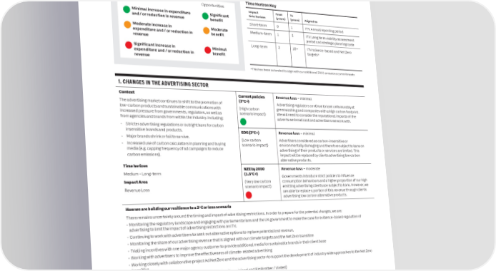 66 ITV plc Annual Report and Accounts 2023 ITV plc Annual Report and Accounts 2023 67 S CLIMATE RELATED FINANCIAL DISCLOSURES CONTINUED T R A T E G I Task Force on Climate-related Financial Relevant Companies (Strategic Report) (Climate-related Relevant Given the evolving nature of climate change and the future policy changes governments globally are considering, there remains a number of C R Disclosures (TCFD) RecommendationSectionFinancial Disclosure (CFD)) Regulations Sectionuncertainties in our modelling. We will continue to review our risks and opportunities in this light and intend to continue building on this analysis E P by modelling further risks and opportunities, as they are identified. As the risks and opportunities have remained consistent with previous O Metrics and Target R years, the methodology used for modelling has remained consistent. T A.Disclose the metrics used by the Metrics & Targets (page 71)H.Describe the key performance Metrics & Targets (page 71) organisation to assess climate-related indicators used to assess progress The RAG rating indicates ITV’s exposure to the key climate related risk areas based on the two opposing scenarios of ‘action’ and ‘no action’ risks and opportunities in line with its against targets used to manage in response to climate change, using an amalgamation of financial impacts and benefits. strategy and risk management climate-related risks and realise process.climate-related opportunities and a Detailed Risks description of the calculations on RAG Key which those key performance Time Horizon Key indicators are based. Risks Opportunities Impact From To B.Disclose Scope 1, Scope 2 and, if Metrics & Targets (pages 36 N/AMinimal increase in expenditure Significant time horizon (years) (years) Aligned to appropriate, Scope 3 greenhouse gas and 71) (GHG) emissions and the related risks. and / or reduction in revenue benefit Short-term 01ITV Annual reporting period Moderate increase in Moderate Medium-term 13ITV Long term viability assessment C.Describe the targets used by the Strategy (page 66)G.Describe the targets used by the Metrics & Targets (page 71) organisation to manage climate-Company to manage climate-related expenditure and / or reduction in benefit period and strategic planning cycle related risks and opportunities and risks and to realise climate-related revenue performance against targetsopportunities and of performance Long-term 3 10+ ITV science-based and Net Zero Significant increase in Minimal targets* against those targets. expenditure and / or reduction in benefit revenue *This has been extended to align with our additional 2050 emissions commitments Risk management Governance Strategy 1. CHANGES IN THE ADVERTISING SECTOR Our approach to identifying, Our governance structures support the PLC To date, ITV has not experienced a material assessing, managing and Board, committees and senior management impact or cost from climate risks and Context Current policies Revenue loss – minimal to ensure that climate change is integrated opportunities. We continue to track these The advertising market continues to shift to the promotion of (3°C+) Advertising regulators continue to look unfavourably at monitoring climate-related risks into our strategy, business process and impacts (such as costs from extreme low-carbon products and sustainable communications with (High carbon greenwashing and companies with a high carbon footprint. and opportunitiesdecision making. For more information on weather events), to monitor if and when this increased pressure from governments, regulators, as well as scenario impact) We will need to consider the reputational impacts of the ITV’s risk management framework provides climate governance, see the Risk and does become the case.from agencies and brands from within the industry. Including: adverts we broadcast and advertisers we work with. the guardrails for risk management activities Uncertainties section.• Stricter advertising regulations or outright bans for carbon and the risk management process supports Our Methodology and insensitive brands and products. SDS (2°C+) Revenue loss – minimal central functions and divisions to identify, Assessing and Managing climate-Assumptions • Major brands shrink or fail to survive. (Low carbon Advertisers considered as carbon-insensitive or assess, manage, monitor and report on risks, related risks and opportunities• Increased use of carbon calculators in planning and buying scenario impact) environmentally damaging and therefore subject to bans on including climate-related risks.We review the Climate Scenario Analysis media (e.g. capping frequency of ad campaigns to reduce Each business area is supported by Green (CSA) on a three year cycle and update the advertising of their products or services are limited. This carbon emissions). impact will be replaced by clients advertising low carbon Climate change is not currently categorised Leads and Green Teams that follow the risk scenarios using the latest science. The alternative products. by the Board as a Group ‘Principal Risk’ as it is management process to identify, assess and assumptions on which our CSA is built have Time horizon manage climate-related risks and not changed since our last assessment. Our NZE by 2050 Revenue loss – moderate unlikely to have a substantial financial impact Medium – Long-term (1.5°C+) in the next three years. It has however been opportunities on a day-to-day basis. They key risk areas remain: Governments introduce strict policies to influence work closely with the Sustainability team Impact Area (Very low carbon consumption behaviours and a higher proportion of our high identified as a key ‘Emerging Risk’ to ITV 1. Changes in the advertising sector scenario impact) emitting advertising clients are subject to bans. However, we with the potential to impact the way we which plays a key role in reviewing these risks Revenue Loss and opportunities