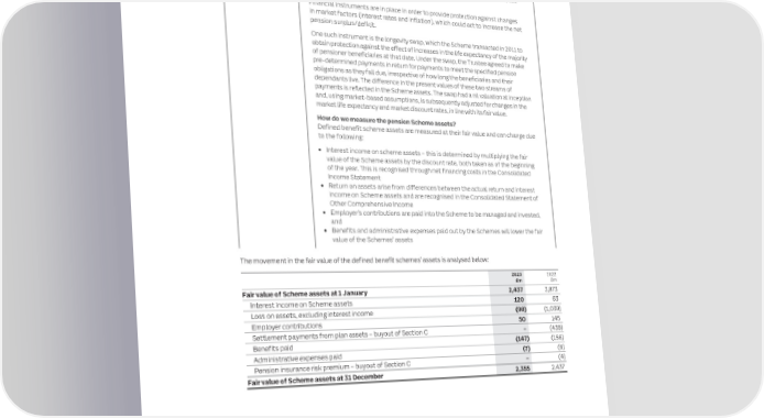 200 ITV plc Annual Report and Accounts 2023 ITV plc Annual Report and Accounts 2023 201 F I NOTES TO THE FINANCIAL STATEMENTS NAN SECTION 3: OPERATING ASSETS AND LIABILITIES CONTINUED C I AL Total defined benefit scheme assets How are the Schemes’ assets invested? S T At 31 December 2023, the Schemes’ assets were invested in a diversified portfolio that consisted primarily of A Keeping The Scheme holds assets across a number of different classes, which are managed T debt securities, infrastructure, property and insurance policies matching pensions due to certain beneficiaries. E it simple by the Trustee, who consults with the Group on changes to its investment policy. M The Trustee is responsible for deciding the investment strategy for the Schemes’ assets, although changes in E N What are the Pension Scheme assets? investment policies require consultation with the Group. The assets are invested in different classes to hedge T At 31 December 2023, the Schemes’ assets were invested in a diversified portfolio against unfavourable movements in the funding obligation. When selecting the mix of assets to hold, and S that consisted primarily of debt securities, infrastructure, property and insurance considering their related risks and returns, the Trustee will weigh up the variability of returns against the target policies matching the pensions due to certain beneficiaries. The tables below set long-term rate of return on the overall portfolio. out the major categories of assets. The fair value of the Schemes’ assets is shown in the following table by major category: Financial instruments are in place in order to provide protection against changes in market factors (interest rates and inflation), which could act to increase the net Market value Quoted Market value Market value Quoted Market value pension surplus/deficit. 2023 2023 2023 2022 2022 2022 £m £m % £m £m % One such instrument is the longevity swap, which the Scheme transacted in 2011 to Liability hedging assets obtain protection against the effect of increases in the life expectancy of the majority Fixed interest gilts 449 449 365 365 of pensioner beneficiaries at that date. Under the swap, the Trustee agreed to make Index-linked interest gilts 516 516 788 786 pre-determined payments in return for payments to meet the specified pension Interest rate and inflation hedging obligations as they fall due, irrespective of how long the beneficiaries and their derivatives dependants live. The difference in the present values of these two streams of (swaps and repos) (112) (142) (375) (401) payments is reflected in the Scheme assets. The swap had a nil valuation at inception 853 823 36% 778 750 32% and, using market-based assumptions, is subsequently adjusted for changes in the market life expectancy and market discount rates, in line with its fair value. Other bonds 1,456 62 62% 1,447 58 59% How do we measure the pension Scheme assets? Defined benefit scheme assets are measured at their fair value and can change due Return seeking investments to the following: Infrastructure 175 174 • Interest income on scheme assets – this is determined by multiplying the fair Property 149 171 value of the Scheme assets by the discount rate, both taken as of the beginning 324 14% 345 14% of the year. This is recognised through net financing costs in the Consolidated Other investments Income Statement • Return on assets arise from differences between the actual return and interest Cash and cash equivalents 41 121 income on Scheme assets and are recognised in the Consolidated Statement of Insurance policies 41 17 Other Comprehensive Income Longevity swap fair value (360) (271) • Employer’s contributions are paid into the Scheme to be managed and invested, (278) (12%) (133) (5%) and Total Scheme assets 2,355 885 100% 2,437 808 100% • Benefits and administrative expenses paid out by the Schemes will lower the fair value of the Schemes’ assets Included in the above are overseas assets of £24 million (2022: £315 million). None of these assets are quoted. The movement in the fair value of the defined benefit schemes’ assets is analysed below: The Trustee entered into a longevity swap in 2011, which hedges the risk of increasing life expectancy over the next 70 years for 11,700 current pensioners at inception covering £1.7 billion of the pension obligation. The fair value of the 2023 2022 longevity swap is negative due to declining mortality assumptions and equals the discounted value of the projected £m £m net cash flows resulting from the contract. The fair value loss has increased in 2023 due to the latest mortality Fair value of Scheme assets at 1 January 2,437 3,873 analysis from the triennial valuation. Interest income on Scheme assets 120 63 Loss on assets, excluding interest income (98) (1,039) Employer contributions 50 145 Settlement payments from plan assets – buyout of Section C – (439) Benefits paid (147) (156) Administrative expenses paid (7) (6) Pension insurance risk premium – buyout of Section C – (4) Fair value of Scheme assets at 31 December 2,355 2,437