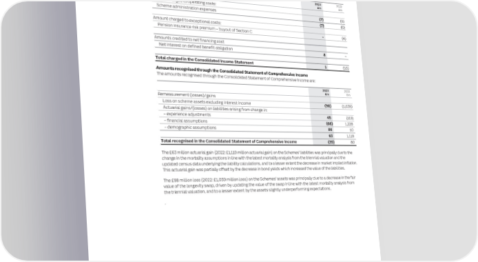 202 ITV plc Annual Report and Accounts 2023 ITV plc Annual Report and Accounts 2023 203 F I NOTES TO THE FINANCIAL STATEMENTS NAN SECTION 3: OPERATING ASSETS AND LIABILITIES CONTINUED C I AL Defined pension deficit sensitivities Keeping What was the impact of movements on the Schemes’ assets and liabilities? S T it simple The notes above describe how the Scheme obligations and assets are comprised A Keeping Which assumptions have the biggest impact on the Scheme? T and measured. The following note sets out the impact of various movements and E it simple It is important to note that comparatively small changes in the assumptions used M expenses of the Scheme on the Group’s financial statements. E may have a significant effect on the Consolidated Income Statement and N T Consolidated Statement of Financial Position. This ‘sensitivity’ to change is Amounts recognised through the Consolidated Income Statement S analysed below to demonstrate how small changes in assumptions can have a large impact on the estimation of the defined benefit pension obligation. The Trustee Amounts recognised through the Consolidated Income Statement are as follows: manages the investment, mortality and inflation risks to ensure the pension obligations are met as they fall due. 2023 2022 £m £m The investment strategy is aimed at the Trustee’s actuarial valuation liabilities Amount charged to operating costs: rather than IAS 19 defined pension liabilities. As such, the effectiveness of the risk Scheme administration expenses (7) (6) hedging strategies on a valuation basis will not be the same as on an accounting (7) (6) basis. Those hedging strategies have significant impact on the movement in the net Amount charged to exceptional costs: pension deficit as assumptions change, offsetting the impacts on the obligation Pension insurance risk premium – buyout of Section C – (4) disclosed below. In practice, changes in one assumption may be accompanied by offsetting changes Amounts credited to net financing cost in another assumption (although this is not always the case). Changes in the Net interest on defined benefit obligation 8 – assumptions may occur at the same time as changes in the market value of Scheme assets, which may or may not offset the changes in assumptions. Total charged in the Consolidated Income Statement 1 (10) Changes in assumptions have a different level of impact as the value of the net pension surplus/(deficit) fluctuates, because the relationship between them is not linear. Amounts recognised through the Consolidated Statement of Comprehensive Income The amounts recognised through the Consolidated Statement of Comprehensive Income are: The analysis below considers the impact of a single change in principal assumptions on the defined benefit obligation 2023 2022 while keeping the other assumptions unchanged and does not take into account any risk hedging strategies: £m £m Remeasurement (losses)/gains Assumption Change in assumption Impact on defined benefit obligation Loss on scheme assets excluding interest income (98) (1,039) Discount rate Increase by 0.1% Decrease by £25 million Actuarial gains/(losses) on liabilities arising from change in: Decrease by 0.1% Increase by £25 million – experience adjustments 45 (119) Increase by 0.5% Decrease by £115 million – financial assumptions (68) 1,228 Decrease by 0.5% Increase by £125 million – demographic assumptions 86 10 Rate of inflation Increase by 0.1% Increase by £10 million 63 1,119 (Retail Price Index) Decrease by 0.1% Decrease by £10 million Rate of inflation Increase by 0.1% Increase by £5 million Total recognised in the Consolidated Statement of Comprehensive Income (35) 80 (Consumer Price Index) Decrease by 0.1% Decrease by £5 million The £63 million actuarial gain (2022: £1,119 million actuarial gain) on the Schemes’ liabilities was principally due to the Life expectancies Increase by one year Increase by £70 million change in the mortality assumptions in line with the latest mortality analysis from the triennial valuation and the updated census data underlying the liability calculations, and to a lesser extent the decrease in market implied inflation. The sensitivity analysis has been determined by extrapolating the impact on the defined benefit obligation at the This actuarial gain was partially offset by the decrease in bond yields which increased the value of the liabilities. year end with changes in key assumptions that might reasonably occur. The £98 million loss (2022: £1,039 million loss) on the Schemes’ assets was principally due to a decrease in the fair While the Schemes’ risk hedging strategy is aimed at a valuation basis, the Directors estimate that on an accounting value of the longevity swap, driven by updating the value of the swap in line with the latest mortality analysis from basis any change in asset values would significantly offset the above impact on the defined benefit obligation. the triennial valuation, and to a lesser extent by the assets slightly underperforming expectations. In particular, while an increase in assumption of life expectancies by one year would increase the defined benefit . obligation by £70 million, the assets would benefit from an estimated increase of the value of the longevity swap by £60 million, resulting in a net increase in the defined pension deficit of £10 million. Further, the ITV Pension Scheme invests in UK government bonds and interest rate and inflation swap contracts and therefore movements in the defined benefit obligation are typically offset, to an extent, by asset movements.