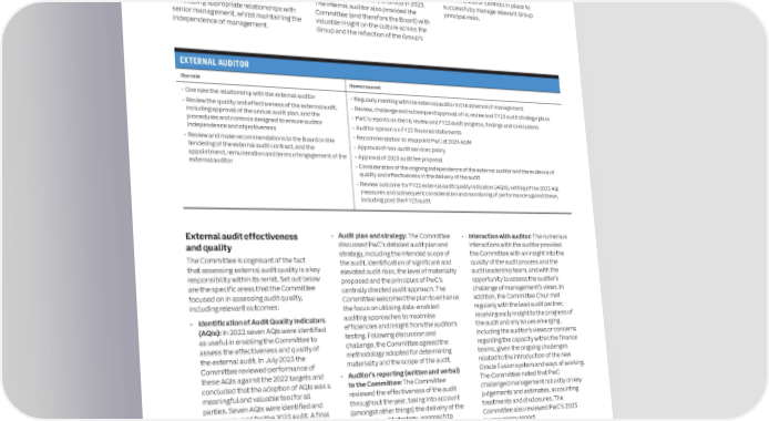 114 ITV plc Annual Report and Accounts 2023 ITV plc Annual Report and Accounts 2023 115 AUDIT AND RISK COMMITTEE REPORT CONTINUED G O VE R NAN The Committee concluded that overall it was Prior to the start of the year, the Committee values by management and other C CLIMATE-RELATED GOVERNANCE pleased with the quality and insight provided considered and approved the 2023 internal employees. A cultural assessment is E by the internal audits completed, particularly audit plan, which was structured to align with routinely incorporated in audit ratings. Our roleItems covered the specialist audits, with material ITV’s strategic drivers and principal risks and Review of ITV’s global environmental and climate risk Reviewed:improvements in various control areas and addressed operational, financial, The Committee is satisfied that, during mitigation strategy, targets, progress and reporting in • Report from the independent provider of limited assurance over Greenhouse Gas (GHG) processes being implemented as a result of compliance and technology controls and a 2023, delivery of the approved internal compliance with the Task Force on Climate-related Financial emissions data, including Scope 1, 2 and 3internal audit recommendations. In reaching number of key operational risks. The internal audit strategy and plan provided timely Disclosures (TCFD), Climate-related Financial Disclosures this conclusion the Committee audits performed provided assurance over and appropriate assurance on the (CFD) and other environmental reporting requirements, • ITV’s TCFD reporting, including ITV climate scenario analysis and consequential risks and and readiness for publishing a Climate Transition Plan, impact (including financial).acknowledged that the EY internal audit areas deemed to be of greater risk and effectiveness of controls in place to in accordance with the UK government’s Transition Plan • Climate risk embedded into ITV’s Principal Risksteam is still familiarising itself with the relative importance to the Group in 2023. successfully manage relevant Group Taskforce recommendation, alongside preparation for • Roadmap to achieve Net Zero detailed in Climate Transition Plan, published alongside various businesses of the Group and The internal auditor also provided the principal risks. EU Corporate Sustainability Reporting Directive disclosure Annual Report and Accounts. developing appropriate relationships with Committee (and therefore the Board) with in 2026. senior management, whilst maintaining the valuable insight on the culture across the Assessing the integrity of the targets and data included in independence of management. Group and the reflection of the Group’s the reporting and obtaining appropriate assurance on its completeness, reasonableness and accuracy. EXTERNAL AUDITOR Climate-related governanceThe Committee also reviewed the The Committee is encouraged by the Our role Items covered The Committee plays a key role in the methodology and internal quality assurance continued progress made by management to processes over GHG emissions reporting, meet the minimum requirements for TCFD • Oversee the relationship with the external auditor • Regularly meeting with the external auditor in the absence of management governance of climate-related risks and following the implementation of a new disclosures, and in starting to deliver against • Review the quality and effectiveness of the external audit, • Review, challenge and subsequent approval of H1 review and FY23 audit strategy/plans opportunities and the Group’s compliance environmental reporting system across ITV, ITV’s ambitious environmental targets. The including approval of the annual audit plan, and the • PwC’s reports on the H1 review and FY23 audit progress, findings and conclusions with environmental and climate risk related and the results of the independent limited Committee also noted the significant procedures and controls designed to ensure auditor • Auditor opinion on FY23 financial statements regulatory reporting requirements. During independence and objectiveness 2023, management briefed the Committee assurance provided over carbon footprint improvements in the management of • Review and make recommendations to the Board on the • Recommendation to reappoint PwC at 2024 AGM on progress in further embedding climate data. ITV has appointed EcoAct as its environmental targets and climate-related tendering of the external audit contract, and the • Approval of non-audit services policy action, risks and opportunities into the sustainability partner to advise on TCFD and risks and opportunities and the continuing appointment, remuneration and terms of engagement of the • Approval of 2023 audit fee proposal running of the business (and potential CFD recommendations and best practice progress made to enhance the approach and external auditor • Consideration of the ongoing independence of the external auditor and the evidence of financial implications), including the planned and highlight areas for improvement. In to strengthen the quality of reporting that quality and effectiveness in the delivery of the audit publishing of its first Climate Transition Plan addition to reviewing ITV’s 2023 TCFD will continue into 2024. • Review outcome for FY22 external audit quality indicators (AQIs), setting of the 2023 AQI in 2024 and the steps taken to enhance ITV’s disclosure against TCFD and CFD measures and subsequent consideration and monitoring of performance against these, alignment to the TCFD and CFD criteria and recommendations, EcoAct has also A key area of focus for the Committee during including post the FY23 audit related disclosures. The Committee agreed assessed the report against the Climate 2024 will be ensuring the Company continues with management’s assessment that the Financial Disclosure recommendations, to respond appropriately to the rapidly financial impact of known risks and f