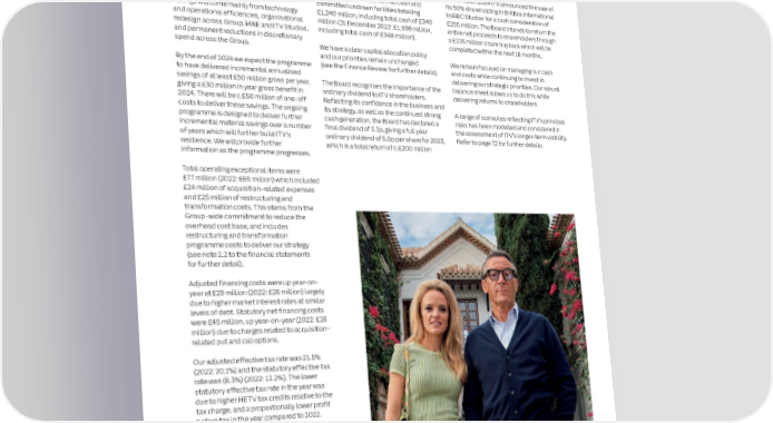 18 ITV plc Annual Report and Accounts 2023 ITV plc Annual Report and Accounts 2023 19 S T OPERATING AND FINANCIAL PERFORMANCE REVIEW R A T E G I ITV continued to successfully execute its strategy in 2023 despite the We are now in the early stages of a new At 31 December 2023 we had £361 million (2022: 5.0p). The Board remains committed C R strategic restructuring and efficiency of free cash flow (31 December 2022: to paying a full year ordinary dividend of at E P challenging macroeconomic environment. It delivered a robust financial programme across the Group to reshape the £280 million), our net debt was £553 million least 5.0p in 2024, which it expects to grow O R performance with ITV Studios recording its highest-ever revenues and profit, cost base, enhance profitability, and support (31 December 2022: £623 million) and our over the medium term, whilst balancing T the growth drivers of Studios and Streaming. net debt to adjusted EBITDA was 1.0x further investment in our strategy and our and within Media & Entertainment (M&E), ITVX drove a step change in key We are building on the foundations we have (31 December 2022: 0.8x). Refer to the commitment to investment grade metrics established in digital and data and the Finance Review for more detail. over the medium term. viewing metrics and delivered strong growth in digital advertising revenues. significant progress we have made in transforming ITV from a linear broadcaster to We have good access to liquidity. On 01 March 2024 ITV announced the sale of a multi-platform broadcaster and streamer. At 31 December 2023, we had cash and its 50% shareholding in BritBox International committed undrawn facilities totalling to BBC Studios for a cash consideration of Savings will come mainly from technology £1,240 million, including total cash of £340 £255 million. The Board intends to return the FINANCIAL HIGHLIGHTS1 and operational efficiencies, organisational million (31 December 2022: £1,098 million, entire net proceeds to shareholders through redesign across Group, M&E and ITV Studios, including total cash of £348 million). a £235 million share buyback which will be and permanent reductions in discretionary completed within the next 18 months. 20232022ChangeChange spend across the Group. We have a clear capital allocation policy Twelve months to 31 December£m£m £m % and our priorities remain unchanged We remain focused on managing our cash ITV Studios2,1702,096744 By the end of 2024 we expect the programme (see the Finance Review for further details). and costs while continuing to invest in M&E2,0902,249(159)(7) to have delivered incremental annualised delivering our strategic priorities. Our robust Total revenue4,2604,345(85)(2)savings of at least £50 million gross per year, The Board recognises the importance of the balance sheet allows us to do this while Internal supply(636)(617)(19)(3)giving a £30 million in year gross benefit in ordinary dividend to ITV shareholders. delivering returns to shareholders Total external revenue3,6243,728(104)(3)2024. There will be c.£50 million of one-off Reflecting its confidence in the business and ITV Studios adjusted EBITA2862592710costs to deliver these savings. The ongoing its strategy, as well as the continued strong A range of scenarios reflecting ITV’s principal programme is designed to deliver further cash generation, the Board has declared a risks has been modelled and considered in M&E adjusted EBITA205464(259)(56)incremental material savings over a number final dividend of 3.3p, giving a full year the assessment of ITV’s longer-term viability. Adjusted EBITA491723(232)(32)of years which will further build ITV’s ordinary dividend of 5.0p per share for 2023, Refer to page 72 for further details. Unrealised profit in stock adjustment(2)(6)467resilience. We will provide further which is a total return of c.£200 million Group adjusted EBITA489717(228)(32)information as the programme progresses. Group adjusted EBITA margin13%19%(6%) pts Statutory operating profit238519(281)(54)Total operating exceptional items were £77 million (2022: £65 million) which included Profit before tax (adjusted)396672(276)(41)£24 million of acquisition-related expenses Adjusted EPS (p)7.8p13.2p(5.4p)(41)and £25 million of restructuring and Statutory EPS (p)5.2p10.7p(5.5p)(51)transformation costs. This stems from the Group-wide commitment to reduce the overhead cost base, and includes KEY FINANCIALS1 restructuring and transformation programme costs to deliver our strategy (see note 2.2 to the financial statements Group external revenueTotal ITV Studios revenueTotal digital revenueGroup adjusted EBITAfor further detail). £3,624m£2,170m£490m£489m Adjusted financing costs were up year-on- -3% vs 2022+4% vs 2022 +19% vs 2022 -32% vs 2022year at £29 million (2022: £26 million) largely due to higher market interest rates at similar levels of debt. Statutory net financing costs Statutory operating profitAdjusted EPSStatutory EPSNet debtwere £45 million, up year-on-year (2022: £26 £238m7.8p5.2p£553m million) due to charges related to acquisition- related put and call options. -54% vs 2022 -41% vs 2022 -51% vs 202231 Dec 2022: £623m Our adjusted effective tax rate was 21.5% (2022: 20.1%) and the statutory effective tax 1. We measure performance through a range of metrics, particularly through our APMs and KPIs, as well as statutory results, all of which are set out and defined in the rate was (8.3%) (2022: 13.2%). The lower APMs section statutory effective tax rate in the year was due to higher HETV tax credits relative to the tax charge, and a proportionally lower profit before tax in the year compared to 2022. Group financial overview Group adjusted EBITA decreased by 32%, savings from changes in our operating model 2023 was the second-highest total revenue reflecting the challenging advertising market in M&E, permanent operational efficiencies Adjusted EPS for the year was 7.8p (2022: outturn