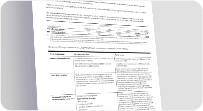 130 ITV plc Annual Report and Accounts 2023 ITV plc Annual Report and Accounts 2023 131 G ANNUAL REPORT ON REMUNERATION O VE R NAN The performance measures and weightings for 2023 bonuses were the same as in previous years. For 2023, 10% of the bonus was assessed The sections of the Annual Report on Remuneration that have been audited C against a scorecard of ESG measures linked to our carbon footprint, the sustainability of our UK productions and commissions and progress E by PwC are indicated with headings throughout the report. towards our diversity goals. The balance of the bonus was linked to EBITA (60%), cash conversion (10%) and individual personal and strategic targets (20%). The majority of the 2023 bonus (70%) was based on the achievement of corporate and financial targets, with bonus outcomes determined in Remuneration Policy application in 2023accordance with pre-set target ranges. In line with the principles applied in previous years, the financial outcomes used for the bonus are The following section provides details of how the current Remuneration Policy was implemented in 2023.adjusted (both positively and negatively) for certain items, such as acquisitions and currency movements to ensure a fair like-for-like comparison with the targets set at the start of the year. Executive Directors – Audited The table below sets out in a single figure the total remuneration for both Executive Directors for the financial year. As part of the assessment of performance, the Committee also undertook a holistic review of overall performance, to ensure that outcomes were a fair reflection of the underlying business performance. Carolyn McCallChris Kennedy The corporate and financial targets applied for 2023, together with performance against those targets and the resulting level of bonus, are set 2023202220232022 out in the table below. Notes£000£000£000£000 Salary1,010971723695 Taxable benefits18181818 The adjusted EBITA ranges were set at the start of the year to reflect the market expectations for an anticipated slowdown in advertising Pension911466562 spend, as well as the impact of our continued budgeted investment in content and technology. The target ranges set therefore reflect this Total fixed remuneration1,1191,135806775external market and investment context. Annual Incentive (Bonus – cash and shares)11,0261,429673937 Performance required ESP / LTIP awards2, 37361,126447684 Performance Pay-out level Save As You Earn (SAYE)4––5– Performance measure Weighting 20% 50% 80% 100% achieved (% of maximum) ITV adjusted EBITA1 60% £473m £503m £523m £573m £491m 38.2% Total variable remuneration1,7622,5551,1251,621 ITV cash conversion2 10% 66% 72% 75.6% 78% 102% 100% Total2,8813,6901,9312,396 1. The ITV EBITA outcome was adjusted for translational currency movements. Outperformance in Studios profitability was balanced by the impact of contraction in the wider advertising market. This resulted in EBITA performance towards the lower end of the range. 1. Two-thirds of the annual bonus is settled in cash and one-third is deferred into shares awarded under the ITV Deferred Share Award plan which automatically release on the third 2. While overall cash conversion performance was strong and supported the payout level, it was recognised that performance relative to the target range was partly attributable anniversary of the award, subject to continued employment.to a favourable movement in working capital, in part due to the impact of the US writers and actors strike expected to unwind in 2024. See page 14 for more information. 2. The 2021 ESP awards were subject to a performance underpin assessed based on results for the year ended 31 December 2023. The amount shown is the indicative vesting value using the average share price in Q4 of 2023 (63.31 pence). The awards will vest in May 2024 and will include dividend shares reinvested. Following a two year holding period, they will become exercisable from May 2026. These awards were granted based on a share price of 123.37 pence, therefore the values shown do not include an amount attributable to share The annual ESG targets applied for 2023, together with performance against those targets are set out below. price growth. 3. In the 2022 Annual Remuneration Report, the amount shown for share awards for both Executive Directors was the indicative vesting value of the 2020 LTIP award that was subject to performance conditions measured to 31 December 2022 using the average share price in Q4 2022 (70.67 pence). The figure shown in the table above represents the subsequent Social purpose goalScorecard objectivesAchievement value received on the vesting date of 6 April 2023 using the share price on that date (80.82 pence). These awards are subject to a two year holding period. 4. Chris Kennedy was granted share options under the SAYE on 13 September 2023 at a 20% discount of the ITV share price at the time of grant. The amount disclosed is the value of Net zero carbon emissions1 Scope 1 and 2 emissions to be below 7,271 tonnes of CO e, in Combined scope 1 and 2 emissions were 42% lower than the the total discount when investing the maximum (£500 per month) over a three year contracted period. 2 line with our SBTi trajectory. target set for 2023. The aggregate emoluments for all Directors as required under Schedule 5 (SI 2008/410), is the total remuneration shown in the table above Business travel emissions to be below 39,257 tonnes of Scope 3 business travel emissions were 39% lower than the CO2e, in line with our SBTi trajectory. target set for 2023. less share awards but including gains on exercise of options and amounts receivable under LTIPs, plus the total emolument figures for Non-executive Directors shown on page 134. Actual emissions performance is reflective of reduced studios output due to the industry strikes during 2023. Further information in relation to each of the elements of remuneration for 2023 set out in the table above