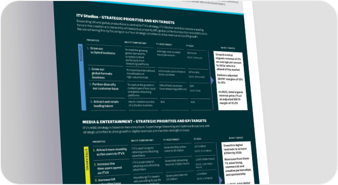 10 ITV plc Annual Report and Accounts 2023 ITV plc Annual Report and Accounts 2023 11 S CHIEF EXECUTIVE’S STATEMENT CONTINUED T R A T E G I Media & Entertainment (M&E) C R E P ITV M&E is the largest commercial OUR MORE THAN TV STRATEGY O R broadcaster and streamer in the UK, Our strategy is focused on three strategic pillars 1) Expand Studios; 2) Supercharge To support the successful delivery of the strategy, we have key The successful execution of our strategy to date has made ITV more T delivering unrivalled audience scale and Streaming; and 3) Optimise Broadcast. These pillars are underpinned by a number of performance indicators (KPIs) and related targets to be delivered robust. ITV has a leading, scaled, global Studios business, a high reach. It is underpinned by two strategic priorities (detailed below) to ensure that ITV is best placed to capitalise on the from 2021 to 2026 which we are on track to deliver. The key to growth Streaming service and a cash generative linear advertising pillars; Supercharge Streaming and opportunities presented by the rapidly changing viewing, content production and successfully delivering this strategy is digitally transforming business. This ensures that we are well placed to grow profits from Optimise Broadcast.advertising environments. These pillars are not independent. They work together – everything we do. here as we continue to drive material efficiencies, invest behind our reinforcing each other, creating synergies and delivering value. strategic priorities and deliver returns to shareholders. By Supercharging Streaming, we aim to drive digital revenues through ITVX and Planet V (ITV’s proprietary, self-service programmatic addressable advertising platform). We launched ITVX on time and our investment is on plan and on budget. In our first full year 2026 STUDIOS ITV Studios – STRATEGIC PRIORITIES AND KPI TARGETS of ITVX we delivered a step change in viewing TARGETExpanding UK and global productions is central to ITV’s strategy. ITV Studios’ ambition is to be a leading and digital revenues were up 19%. We Grow total organic force in the creation and ownership of intellectual property (IP), global content production and distribution. increased the number of monthly active users revenues by 5% on We are achieving this by focusing on our four strategic priorities to drive revenue and profit growth. by almost 20%, up to 12.5 million and those average per annum to 2026 – which is ahead users are spending more time engaging with of the market at a the platform with streaming hours up 26% PRIORITIES WHY IT’S IMPORTANT FY 2026 TARGET FY 2023 WHAT IT DRIVES margin of 13% to 15% to 1.5 billion hours. Brand awareness is now expandSTU1. Grow our To meet the growing 400 high-end scripted 316 hours Growth in total up to over 90% and we have seen a significant global demand for hours per annum scripted business organic revenue of 5% increase in streaming hours for light viewers STUDIOSD (2022: 276 hours) I scripted content who are harder to reach, up 65%, and our key O on average per annum Further expanding by genre, S particularly from 1 target audience of 25-54s which was up 47%. streaming platforms to 2026 which is geography and customer and ahead of the market growing faster than market To maximise international 20 formats sold in three or 19 formats The key focus of ITVX is our ad-funded 2. Grow our Delivers adjusted global formats monetisation of more countries (2022: 19 formats) proposition which is where we have EBITA2 business high-value formats margins of 13% channelled our efforts and resources in to 15% its launch year. In addition, we have ITVX 3. Further diversify To capture the growth in 30% of total revenues 32% Premium, a subscription service, which is superchargeour customer base content spend from local from streaming platforms primarily an ad-free offering for viewers. The (2022: 22%) In 2023, total organic Vertically and global streaming number of paid-for UK subscribers declined STREAMINGIntegrated platforms revenue grew 3% at marginally year on year as we started Driving digital viewing and Producer an adjusted EBITA transitioning subscribers from our standalone revenue through ITVX and Planet V, Broadcaster 4. Attract and retain Key to creative success N/A N/A margin of 13.2% ITV’s leading addressable and Streamer leading talent of a Studios business app, BritBox UK, into ITVX Premium, combined with the closure of the ITV Catch Up service advertising platform on Amazon Prime Video Channels. In 2024, the BritBox UK service on Amazon optimiseMEDIA & ENTERTAINMENT – STRATEGIC PRIORITIES AND KPI TARGETS Prime Video Channels and the Britbox UK ITV’s M&E strategy is based on two core pillars: Supercharge Streaming and Optimise Broadcast, with standalone app will close as we further BROADCASTstrategic priorities to drive growth in digital revenues and maintain strength in linear. simplify our offering. This will consolidate Digitally transforming as we all our subscribers under one ITVX Premium continue to attract commercial PRIORITIES WHY IT’S IMPORTANT FY 2026 TARGET FY 2023 WHAT IT DRIVES brand and will give us complete ownership broadcast audiences of unparalleled scale S of the subscriber base. The closure of these TR1. Attract more monthly ITV’s reach is key to Grow monthly active 12.5 million Growth in digital retaining and attracting users to 20 million services is expected to impact subscriber E active users to ITVX (2022: 10.5 million) revenues to at least numbers and subscription revenues in 2024.A advertisers £750m by 2026 2026 M&E TARGET MI Grow digital revenues N 2. Increase the ITV’s scale is key to Grow total streaming 1,505 million hours Revenues from linear Planet V is the platform enabling the to at least £750m Gtime users spend retaining and attracting hours to 2 billion hours (2022: 1,192 million TV advertising, growth of ITV’s digital advertising – it is a across M&Eon ITVX advertisers h