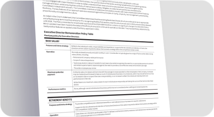 122 ITV plc Annual Report and Accounts 2023 ITV plc Annual Report and Accounts 2023 123 G DIRECTORS’ REMUNERATION POLICY O VE R NAN The following sets out the proposed ITV Directors’ Remuneration Policy C BENEFITS E (the Policy). The Policy is subject to a binding shareholder vote at ITV’s Purpose and link to strategy Ensures the overall package is competitive and provides financial protection for employees and their families. AGM on 2 May 2024 and, if approved, will apply from this date. Operation The Company provides a range of market competitive benefits, which may include travel-related benefits, participation in all-employee share schemes, private medical insurance and other insurance benefits. Additional benefits may also be provided in certain circumstances, if required for business needs. For example (but not The previous Policy was last renewed at the 2021 AGM, when the Company implemented a new Restricted Shares structure. limited to), relocation expenses, housing allowance and education support. Maximum potential Set at a level which the Committee considers to be appropriately positioned taking into account typical market levels for The Committee discussed the current Policy over a series of meetings throughout 2023 and early 2024, debating its continued payment comparable roles, individual circumstances and the overall cost to the business. effectiveness given the strategic priorities of the business, the cyclical nature of the sector, evolving market trends and investor guidance. While there is no maximum monetary value for benefits, any benefits provided will be reasonable in the context of relevant We also engaged with major investors in order to better understand their views around our pay approach. Input was sought from the market practice, individual circumstances and overall cost to the business. management team, while ensuring that conflicts of interest were suitably mitigated. An external perspective was provided by the Committee’s independent advisers. The Committee undertook an extensive consultation process with major shareholders before finalising In addition, the Company may reimburse relocation expenses and/or provide for tax equalization arrangements. Participation the Policy. The key features of our approach were also assessed against the principles of clarity, simplicity, risk management, predictability, in any tax-approved all-employee share plans will be limited by the maximum permitted under the relevant legislation. proportionality and alignment to culture. As noted in the Chair’s statement, the Committee determined that the existing Restricted Shares structure continues to be an appropriate and effective long-term incentive vehicle for ITV, recognising that the first awards under this structure will vest in 2024 and will not be released Variable pay policy for Executive Directors until 2026. The Policy presented for shareholder approval at the 2024 AGM therefore contains no significant changes from the 2021 Policy. ANNUAL BONUS SCHEME (BONUS) AND DEFERRED SHARE AWARD PLAN (DSA) Minor updates have been made to the detail of the Policy to ensure it continues to operate as intended. The proposed Policy retains the key best practice features as applied under the Policy approved in 2021. Purpose and link to strategy Incentivises executives and colleagues to achieve key strategic outcomes on an annual basis. Focus on key financial metrics and corporate objectives to deliver the business strategy. Executive Director Remuneration Policy Table The element of the Bonus compulsorily deferred into shares rewards delivery of sustained long-term performance, provides Fixed pay policy for Executive Directors alignment with the shareholder experience and supports the retention of executives. Operation Measures and targets are set annually, normally based on business plans at the start of the financial year and pay-out levels BASE SALARY are determined by the Committee following the year end based on performance against objectives. Purpose and link to strategy Reflects the individual’s skills, responsibilities and experience. Supports the recruitment and retention of Executive Paid once the results have been audited. Financial results used for bonus calculation will be subject to suitable review (e.g. Directors of the calibre required to deliver the business strategy within the competitive media market. sign-off by Audit and Risk Committee) before consideration by the Committee. Operation Normally reviewed annually and paid monthly in cash. Consideration is typically given to a range of factors when determining The Committee has the discretion to amend the bonus outcome if any formulaic assessment of performance is considered salary levels, including: to be inappropriate taking into account factors such as a balanced view of overall business or individual performance for the year, and the original intentions of the plan. • Personal and Company-wide performance • Scope of role and experience Not more than two-thirds of the Bonus is delivered in cash with the balance deferred into shares under the DSA normally for a period of three years. • Typical pay levels in relevant markets for each executive whilst recognising the need for an appropriate premium to attract and retain superior talent, balanced against the need to provide a cost-effective overall remuneration package During the deferral period share awards may be reduced or cancelled in certain circumstances. Dividends or equivalents may • The wider employee pay review be earned on deferred shares. Maximum potential Ordinarily salary increases will be in line with the average increase awarded to other employees in the Company. Increases Maximum potential The maximum Bonus opportunity for any Executive Director will not exceed 200% of salary. payment may be made above this level to take account of individual and business circumstances, which may include factors such as: payment The current maximum B