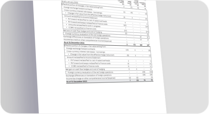 216 ITV plc Annual Report and Accounts 2023 ITV plc Annual Report and Accounts 2023 217 F I NOTES TO THE FINANCIAL STATEMENTS NAN SECTION 4: CAPITAL STRUCTURE AND FINANCING COSTS CONTINUED C I AL Keeping This table provides a reconciliation of each component of the translation reserve Netting arrangements of financial instruments S T reported within equity and an analysis of other comprehensive income in A it simple T accordance with IAS 1. Keeping This section details the Group’s financial assets and financial liabilities that are E subject to netting and set-off arrangements. Financial assets and liabilities that are M it simple E subject to set-off arrangements and disclosed on a net basis in the Group’s N T Set out below is the reconciliation of each component of the translation reserve reported in the Consolidated Statement of Financial Position relate to cash pooling arrangements. Amounts which S Statement of Changes in Equity and the analysis of other comprehensive income: do not meet the criteria for offsetting on the Consolidated Statement of Financial Position but could be settled net in certain circumstances principally relate to Cash Cost of Foreign derivative transactions executed under ISDA agreements where each party has the flow hedge hedge currency Translation option to settle amounts on a net basis in the event of default of the other party. reserve reserve reserve reserve £m £m £m £m As at 1 January 2022 3 (7) 45 41 Effective portion of changes in fair value arising from: Net financial Foreign exchange forward contracts (1) (4) – (5) Gross collateral assets/liabilities Related amounts Gross financial assets/liabilities per balance not set-off in the Cross-currency interest rate swaps – borrowings: assets/ liabilities set-off sheet balance sheet Net • Change in fair value from the effective hedge instrument 25 4 – 29 At 31 December 2023 £m £m £m £m £m Assets Amount reclassified to Income Statement Derivative financial instruments 5 – 5 (2) 3 • FX forward reclassified to cost of sales/overheads 4 – – 4 Cash and cash equivalents 340 – 340 – 340 • FX forward and swaps reclassified to finance costs (10) – – (10) • Amounts reclassified to work in progress 7 – – 7 Liabilities • CCIRS reclassified to finance costs (27) – – (27) Derivative financial instruments (17) – (17) 2 (15) Net loss on cash flow hedges and cost of hedging (2) – – (2) Loans and facilities (763) – (763) – (763) Foreign currency revaluation of the net foreign operations – – 67 67 Exchange differences on translation of foreign operations – – 67 67 Income tax credit on other comprehensive income/(expense) 1 – – 1 Gross collateral Net financial Related amounts Gross financial assets/liabilities assets/liabilities not set-off in the As at 31 December 2022 2 (7) 112 107 assets/liabilities set-off per balance sheet balance sheet Net At 31 December 2022 £m £m £m £m £m Effective portion of changes in fair value arising from: Assets Foreign exchange forward contracts (13) 4 – (9) Derivative financial instruments 4 – 4 (4) – Cross-currency interest rate swaps – borrowings: Cash and cash equivalents 348 – 348 – 348 • Change in fair value from the effective hedge instrument (9) 2 – (7) Amount reclassified to Income Statement Liabilities • FX forward reclassified to cost of sales/overheads 2 – – 2 Derivative financial instruments (15) – (15) 4 (11) • FX forward and swaps reclassified to finance costs 15 – – 15 Loans and facilities (830) – (830) – (830) • CCIRS reclassified to finance costs 11 – – 11 Net gain on cash flow hedges and cost of hedging 6 6 – 12 Foreign currency revaluation of the net foreign operations – – (38) (38) Exchange differences on translation of foreign operations – – (38) (38) Income tax charge on other comprehensive income/(expense) (1) (2) – (3) As at 31 December 2023 7 (3) 74 78