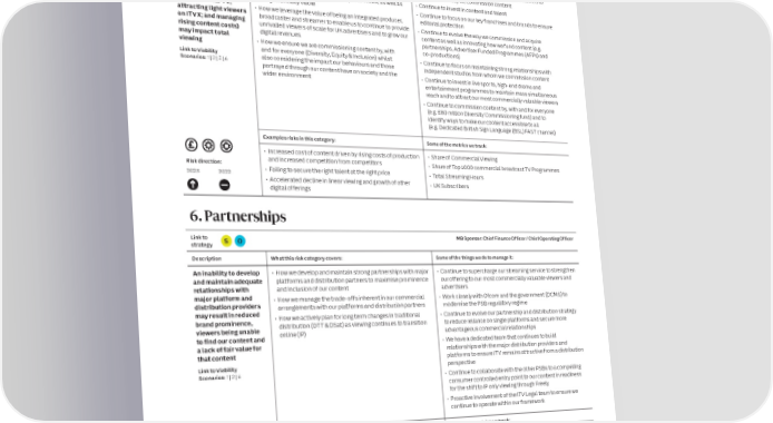 58 ITV plc Annual Report and Accounts 2023 ITV plc Annual Report and Accounts 2023 59 S RISKS AND UNCERTAINTIES CONTINUED T R A T E G I 3. Commercial 5. Content Pipeline C R E P O Link to MB Sponsor: Managing Director, CommercialLink to MB Sponsor: Managing Director, Media & Entertainment R strategyS O strategy S O T DescriptionWhat this risk category covers:Some of the things we do to manage it:DescriptionWhat this risk category covers:Some of the things we do to manage it: Increasing competition • How we compete for share of advertising spend in a • Continue to enhance our integrated advertising proposition Lack of diversified • How we anticipate and adapt to changes in the tastes and • Our data and insights team focuses on understanding the and challenging challenging macroeconomic environment and with the large to offer i) mass simultaneous reach, ii) data driven target commissioning habits of viewerspreferences of our most commercially valuable viewers to advertising market streamers launching advertising tiersaddressable and iii) the ability to integrate brands creatively pipeline (whilst • How we develop a quality and appealing content pipeline that help drive the way we commission content conditions impact • The impact redistribution of advertising budgets away from into our content and the future development of outcome-balancing/maintaining is both resilient to changes in viewer preferences, as well as • Continue to invest in content and talent our revenue stream broadcasting to online platforms could have on ad revenuebased advertising productsmass simultaneous being financially viable• Continue to focus on our key franchises and brands to ensure affecting our ability • How we respond to continued tightening of data protection • Continue to invest and extend Planet V to offer unrivalled reach on linear TV; • How we leverage the value of being an integrated producer, editorial protection to fund our content and privacy regulations that impact our ability to provide addressability at scaleattracting light viewers broadcaster and streamer to enable us to continue to provide budget on ITVX; and managing • Continue to evolve the way we commission and acquire targeted advertising• Continue to offer a unique creative proposition to advertisers rising content costs) unrivalled viewers of scale for UK advertisers and to grow our content as well as innovating how we fund content (e.g. Link to Viability through brand partnerships, product placements, digital revenues partnerships, Advertiser Funded Programmes (AFPs) and Scenarios: 1 | 2 | 4 | 6sponsorships, advertiser funded programmes (AFPs) and may impact total viewing • How we ensure we are commissioning content by, with co-productions) digital advertising solutions and for everyone (Diversity, Equity & Inclusion) whilst • Continue to focus on maintaining strong relationships with • Continue to invest in an outcomes proposition that enables Link to Viability also considering the impact our behaviours and those Scenarios: 1 | 2 | 3 | 6 independent studios from whom we commission content advertisers to measure the effectiveness of their campaignsportrayed through our content have on society and the • Continue to invest in live sports, high-end drama and • Build strategic partnerships with advertisers and agencieswider environment entertainment programmes to maintain mass simultaneous • Continue to monitor the actual and potential advertising reach and to attract our most commercially valuable viewers restrictions • Continue to commission content by, with and for everyone (e.g. £80 million Diversity Commissioning fund) and to Examples risks in this category:Some of the metrics we track: identify ways to make our content accessible to all (e.g. Dedicated British Sign Language (BSL) FAST channel) • Structural decline in broadcast advertising• Total Advertising Revenue (TAR) Risk direction:• Increased competition for market share from the larger • Category spendExamples risks in this category:Some of the metrics we track: 2023 2022streamers introducing ad tiers and the growth of online video • Failure to grow monetisable streaming viewers • Increased cost of content driven by rising costs of production • Share of Commercial Viewing Risk direction: and increased competition from competitors • Share of Top 1000 commercial broadcast TV Programmes • Failing to secure the right talent at the right price 2023 2022 • Total Streaming Hours • Accelerated decline in linear viewing and growth of other • UK Subscribers 4. Changing Viewer Habits digital offerings Link to SOMB Sponsor: Managing Director, Media & Entertainment6. Partnerships strategy DescriptionWhat this risk category covers:Some of the things we do to manage it: Link to S O MB Sponsor: Chief Finance Officer / Chief Operating Officer Inability to respond to • How we attract our most commercially valuable viewers to • Continue to invest in and showcase great content on our strategy changing viewing both linear and streaming contentchannels and ITVX, with a focus on our most commercially DescriptionWhat this risk category covers:Some of the things we do to manage it: habits and deliver the • How we drive reach, scale and simultaneous viewing across valuable viewers forecasted audiences/linear and streaming• Continue to invest in marketing An inability to develop • How we develop and maintain strong partnerships with major • Continue to supercharge our streaming service to strengthen viewing for both linear • How we anticipate, respond and adapt to the shift towards • Continue to evolve our partnership and distribution strategy and maintain adequate platforms and distribution partners to maximise prominence our offering to our most commercially valuable viewers and and streaming will digital viewing, whilst we maintain and increase our share of to position ourselves where our viewers arerelationships with and inc