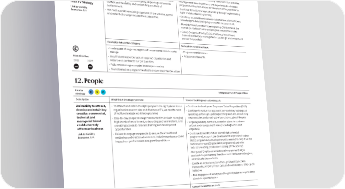 62 ITV plc Annual Report and Accounts 2023 ITV plc Annual Report and Accounts 2023 63 S RISKS AND UNCERTAINTIES CONTINUED T R A T E G I 1 1. Transformation 13. Duty of Care C R E P O Link to MB Sponsor: Chief Finance Officer / Chief Operating Officer Link to MB Sponsor: Chief Executive Officer R strategy E S O strategy E S O T Description What this risk category covers: Some of the things we do to manage it: Description What this risk category covers: Some of the things we do to manage it: We are accelerating • Failing to deliver our transformation ambitions will adversely • Our Transformation Operations Directors Office (TODO) Failure to extend • Ensuring we run our business safely with consideration to our • We maintain a ‘Speaking Up’ framework that allows anyone transformation impact our efficiency, financial performance, and viewer focuses on operational issues and reducing the risk involved an adequate duty of duty of care and the impact we could have on society working for or with ITV to raise concerns in confidence delivery to build a experience while impacting our reputation in a number of significant and costly transformation activities care or the occurrence • Supporting the mental and physical health and safety of through Safecall , alongside other channels to raise concerns. simpler, more efficient • We are focused on enabling and driving digital transformation • Management Board sponsors, and experienced and skilled of a major health and colleagues, those working with ITV and those participating in • Continue to drive awareness of ‘Speaking up’ through and dynamic ITV in by enhancing organisational agility, improving commercial programme directors across all transformation programmes safety incident could and contributing to our productions, is a key priority communications and mandatory duty of care training module pursuit of our More control and flexibility and embedding a culture of • Continue to instil new ways of working through implementing result in physical and • Our commitment to addressing promptly, fairly and • We have a comprehensive operational risk management Than TV Strategy achievement Agile and standardising tooling mental harm, loss of confidentially all concerns and monitoring the channels we process, and through this, we identify risks to both people’s Link to Viability • We do this while remaining cognisant of the volume, speed human life and have in place to ensure they remain appropriate physical and mental health and safety and put in place Scenarios: N/A • Continue to upskill key business stakeholders with sufficient reputational damage and extent of change required to achieve this knowledge to hold their programme teams to account. measures to manage them appropriately Link to Viability • The ITV Feel Good offering continues to provide advice, • Monthly Transformation Steering Group (TSG) to track the Scenarios: N/A overall portfolio delivery and programme dependencies support, resources and tools for inspiring and enabling • Group Design Authority (GDA) and Group Investment colleagues to look after their own well-being and have a Committee (GIC) to manage technical design and investment balanced and healthy working lifestyle in a hybrid world across the portfolio • We continue to evolve the Participant Aftercare Programme (PAP) Examples risks in this category: Some of the metrics we track: • We support participants through the Participant Crisis Care Stabilisation Pathway, an Out of Hours Welfare Helpline and a • Inadequate change management to overcome resistance to • Programme Milestones ‘call off’ contract with the Nightingale Hospital change • Programme Benefits • Partner with the BBC, to develop an Industry Media Risk direction: • Insufficient resource, lack of required capabilities and Psychologist Development Programme 2023 2022 reliance on contractors / third parties • Our social purpose campaigns seek to support the viewing • Failure to manage complex interdependencies public, including the award-winning Britain Get Talking. • Transformation programmes fail to deliver the intended value • Continue to monitor and respond to historical issues to further strengthen our Duty of Care policies 12. People Examples risks in this category: Some of the metrics we track: • Failure to appropriately support individuals working with ITV • Speaking Up data Link to E S O MB Sponsor: Chief People Officer Risk direction: in our pursuit of editorial content that is relevant and • Accident/Incident Data strategy entertaining 2023 2022 Description What this risk category covers: Some of the things we do to manage it: • Failure to adequately consider the impact our content could have on society An inability to attract, • To attract and retain the right people in the right places for an • Continue to develop our Employee Value Proposition (EVP) develop and retain key organisation as complex and diverse as ITV, we need to have • Continue to evolve our approach to mandatory training and creative, commercial, effective strategic workforce planning speaking up through updating existing modules, introducing 14. Third Party Risk Management technical and • Day-to-day people management activities include managing new modules and phasing the launch throughout the year managerial talent high levels of recruitment, onboarding and terminations, and • Ongoing development of succession plans for business could adversely providing access to relevant training and development critical and management roles (including nominated Link to E S O MB Sponsor: Chief Finance Officer / Chief Operating Officer affect our business opportunities deputies). strategy Link to Viability • Failure to engage our people to ensure their health and • Continue to identify future talent (High potential Description What this risk category covers: Some of the things we do to manage it: Scenarios: N/A wellbeing and c